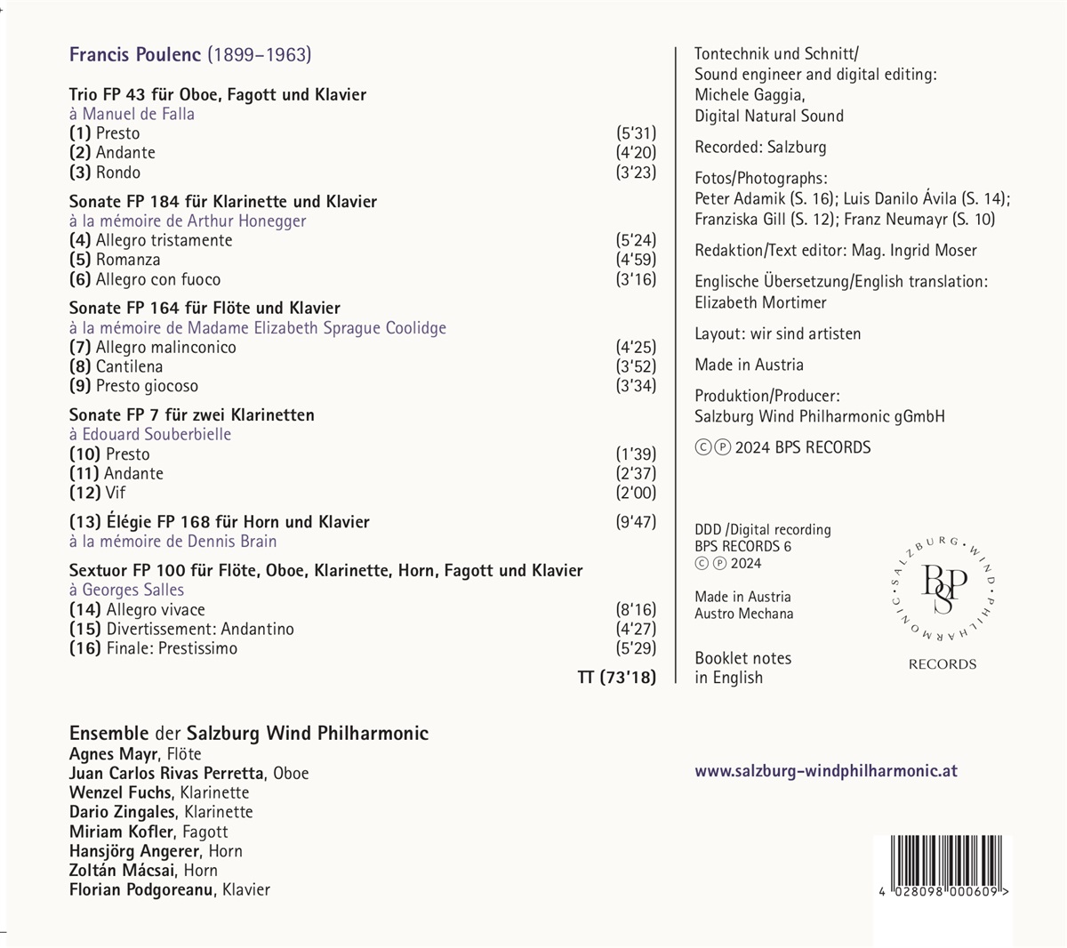 Die Salzburg Windphilhamonic beweist mit diesem Album seine überraschende Bandbreite: Ein Ensemble aus (wechselnden) Musikern und Musikerinnen der SWP haben sich der Kammermusik für Bläser von Francis Poulenc angenommen. Zu hören sind das Trio für Oboe, Fagott und Klavier, die Sonate für Klarinette und Klavier, die Sonate für Flöte und Klavier, die Sonate für zwei Klarinetten, das ungewöhnlich besetzte Sextuor für Flöte, Oboe, Klarinette, Horn, Fagott und Klavier und die Élégie für Horn und Klavier.