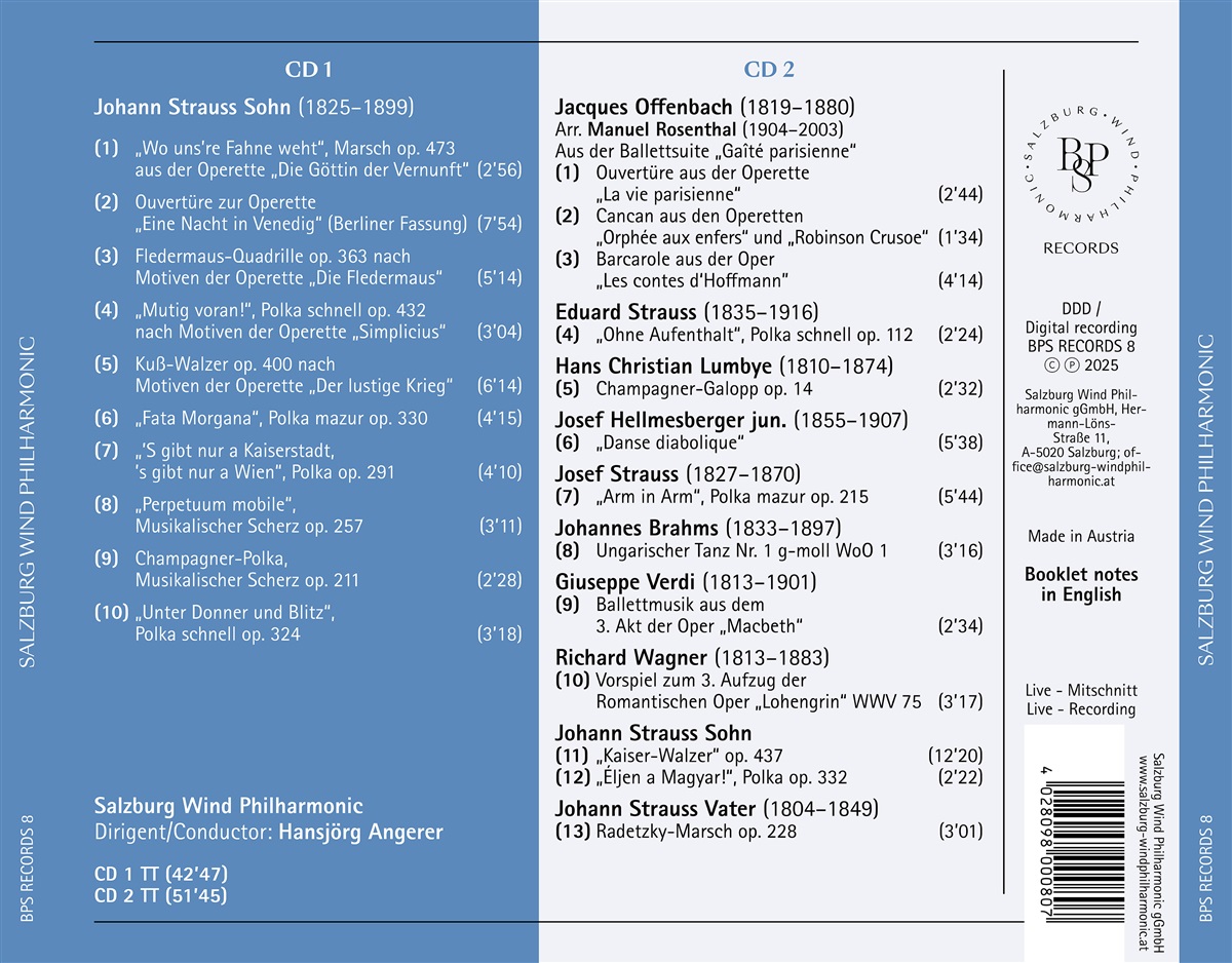 Anlässlich Johann Strauss‘ 200. Geburtstages feiert die Salzburg Wind Philharmonic mit ihrem Chefdirigenten Hansjörg Angerer den Walzerkönig nicht nur mit unvergleichlichen Walzern, die seine außerordentliche Genialität, Fantasie und unendliche Inspiration zum Ausdruck bringen, sondern mit der ganzen Vielfalt typischer Wiener Tanzmusik aus seiner Feder. Als ‚Gratulanten‘ dürfen bei diesem Anlass natürlich Kollegen und Bewunderer von Johann Strauss wie etwa Johannes Brahms, Richard Wagner oder Giuseppe Verdi ebensowenig fehlen wie sein bedeutendster Mitstreiter der leichten Muse, Jacques Offenbach, oder der ‚dänische Strauss‘ Hans-Christian Lumbye. Mit diesen wunderbaren und (be)rauschenden Melodien wird ein einmaliger Geburtstagsreigen zu Strauss‘ Jubiläumsjahr zelebriert!