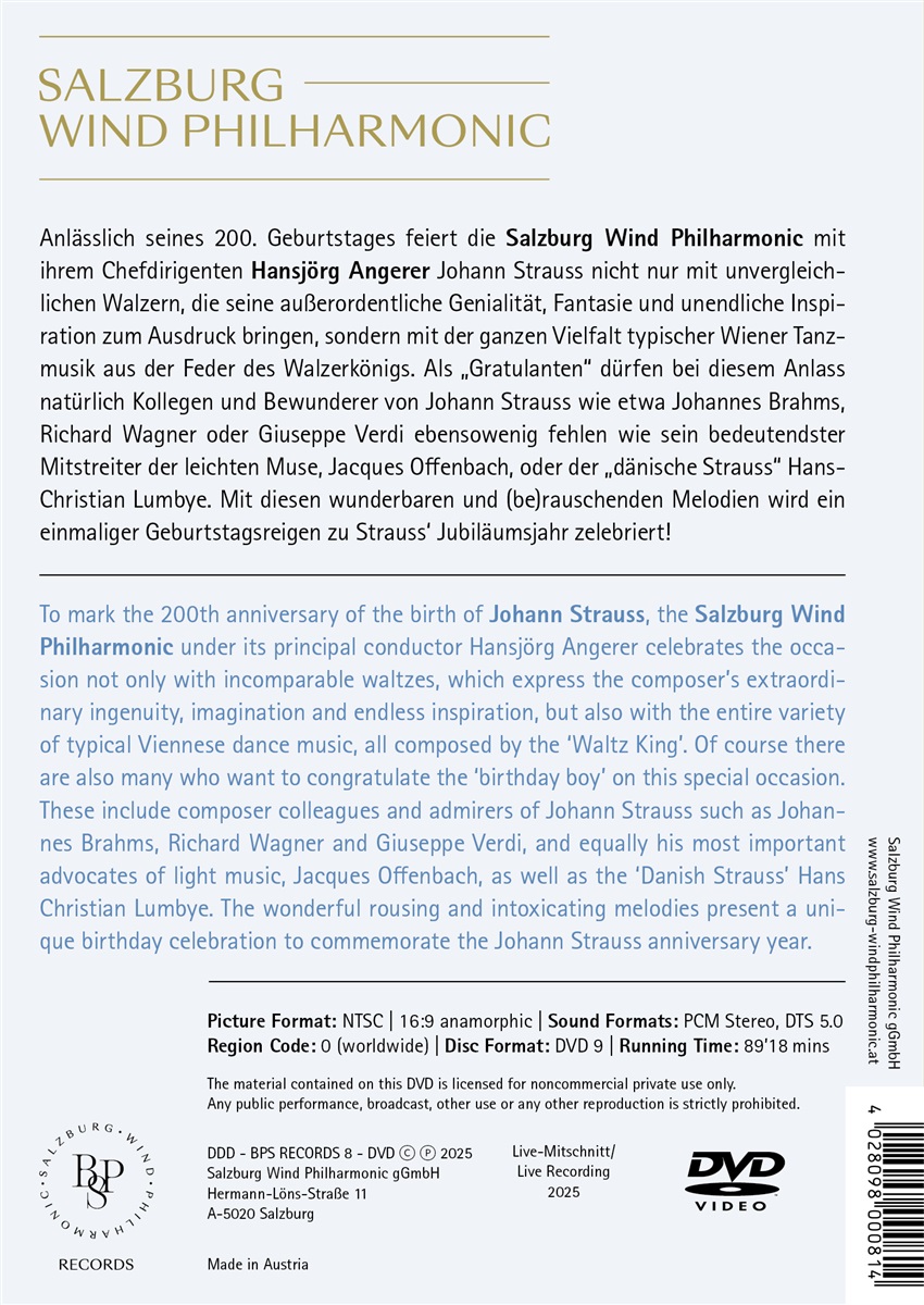Anlässlich Johann Strauss‘ 200. Geburtstages feiert die Salzburg Wind Philharmonic mit ihrem Chefdirigenten Hansjörg Angerer den Walzerkönig nicht nur mit unvergleichlichen Walzern, die seine außerordentliche Genialität, Fantasie und unendliche Inspiration zum Ausdruck bringen, sondern mit der ganzen Vielfalt typischer Wiener Tanzmusik aus seiner Feder. Als ‚Gratulanten‘ dürfen bei diesem Anlass natürlich Kollegen und Bewunderer von Johann Strauss wie etwa Johannes Brahms, Richard Wagner oder Giuseppe Verdi ebensowenig fehlen wie sein bedeutendster Mitstreiter der leichten Muse, Jacques Offenbach, oder der ‚dänische Strauss‘ Hans-Christian Lumbye. Mit diesen wunderbaren und (be)rauschenden Melodien wird ein einmaliger Geburtstagsreigen zu Strauss‘ Jubiläumsjahr zelebriert!
