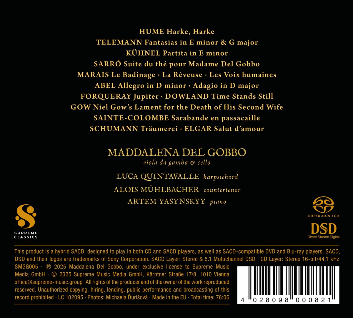 Auf dem Programm stehen Meisterwerke aus fünf Jahrhunderten, darunter Werke von Tobias Hume, Georg Philipp Telemann, Antoine Forqueray, Marin Marais, Monsieur de Sainte-Colombe, Carl Friedrich Abel und John Dowland. Dazwischen finden sich Del Gobbos eigene Bearbeitungen, darunter ihre ergreifende Neuinterpretation von Dowlands „Time Stands Still“, und die Weltersteinspielung der Suite du thé des spanischen Komponisten Arti Sarró - ein stimmungsvolles Werk, das er eigens für sie komponiert hat.