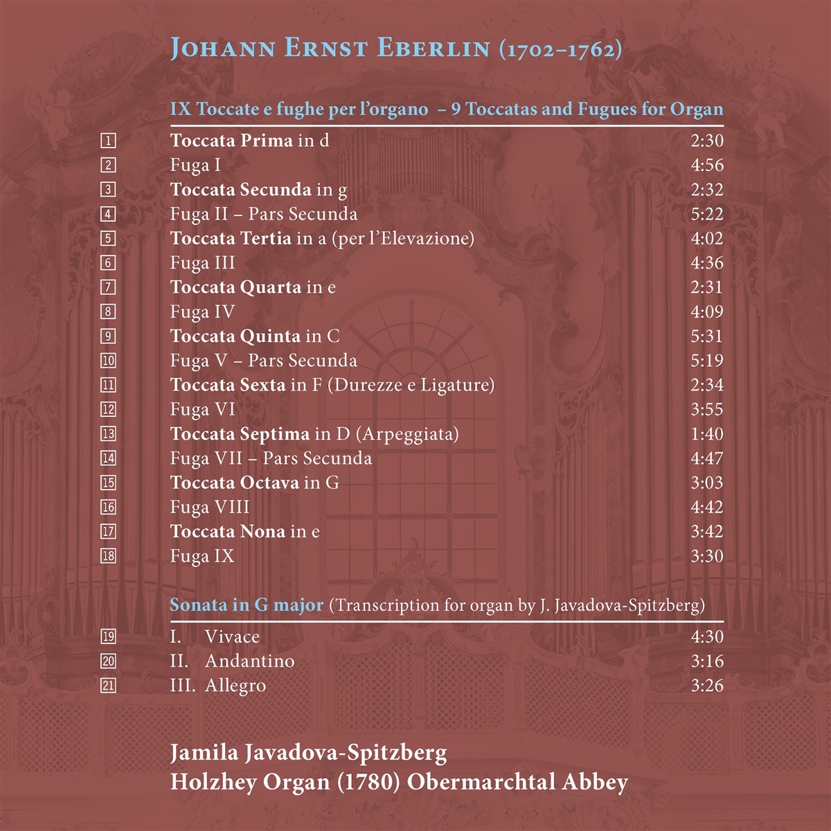 Johann Ernst Eberlin (1702–1762), geboren in Jettingen / Bayern, wurde 1726 Organist am Salzburger Dom. 1749 wurde er zum Hof- und Domkapellmeister ernannt, eine Position, die er bis zu seinem Lebensende innehatte. Als einer der einflussreichsten Komponisten des 18. Jahrhunderts in Salzburg verfasste Eberlin mehrere hundert Messen und andere geistliche Werke für den Dom, die bis zum Ende der 1770er Jahre immer wieder aufgeführt wurden. Sowohl Leopold als auch Wolfgang Amadeus Mozart bewunderten Eberlins liturgische Musik und seine kontrapunktischen Fähigkeiten und kopierten und studierten sie gründlich. Eberlins Sammlung IX Toccate e Fughe per L’Organo (9 Toccaten und Fugen für Orgel) erschien im Jahre 1747. Jamila Javadova-Spitzberg wählte für ihre Einspielung dieser Werke die Johann Nepomuk Holzhey-Orgel von 1780 in der Klosterkirche Obermarchtal. Die Orgel wurde im Jahr 2012 vollständig restauriert und ist eines der bedeutendsten Instrumente der Frühklassik im süddeutschen Raum.