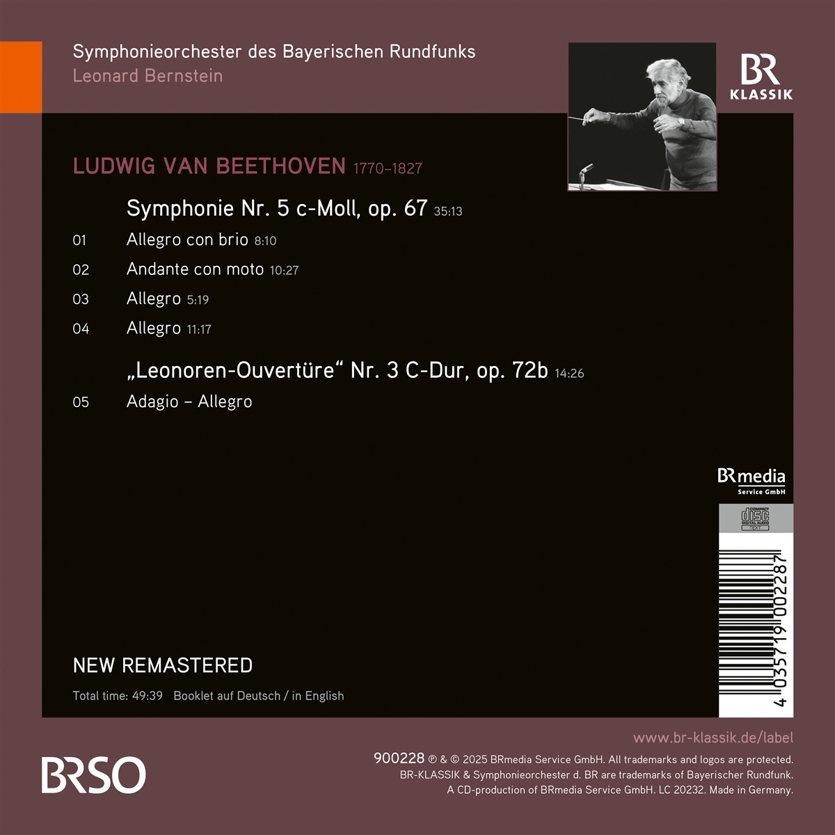 Die vorliegende CD von BR-Klassik präsentiert den Live- Mitschnitt eines Konzerts, in dem Leonard Bernstein Ludwig van Beethovens fünfte Sinfonie sowie die Leonoren-Ouvertüre Nr. 3 dirigierte. Die Sinfonie vertont eher abstrakt einen Befreiungsschlag im Sinne von ‚per aspera ad astra‘ (‚durch das Raue zu den Sternen‘ respektive ‚durch die Dunkelheit zum Licht‘). Die dritte Leonoren-Ouvertüre besticht mit ihrer freigestellten Signal-Trompete, die die Ankunft des Ministers Don Fernando vermeldet – und damit die Rettung Florestans aus willkürlicher Gewalt und Inhaftierung. Die Live-Aufnahme entstand am 17. Oktober 1976 im Deutschen Museum in München mit dem Symphonieorchester des Bayerischen Rundfunks.