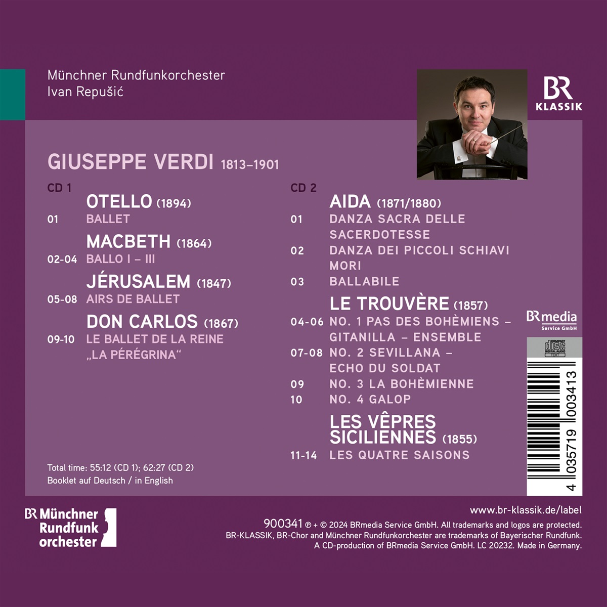 Auf diesem neuen Doppel-Album präsentiert das Münchner Rundfunkorchester unter Leitung seines Chefdirigenten Ivan Repušić Verdis vollständige Ballettmusik. Den Konventionen der Pariser Opéra folgend musste auch Giuseppe Verdi für die französischen Ur- oder Erstaufführungen seiner Bühnenwerke Ballettmusiken schaffen. Zwischen 1847 und 1894 entstanden so insgesamt sieben teils ausführliche sogenannte Divertissements. Mit eingängigen Melodien, schwungvollen, pointiert akzentuierten Rhythmen, klangmalerischen Effekten und plastischer Gestik, vornehmlich jedoch einer ungemein farbenreichen Instrumentation gelang es ihm, der zeitgenössischen Ballettmusik neue Impulse zu verleihen. Während in Produktionen von Verdis Opern die Ballettmusiken lange Zeit in aller Regel gestrichen wurden – mit Ausnahme derjenigen von „Aida“ –, werden sie in jüngster Zeit immer wieder musiziert und auf die Dramaturgie des jeweiligen Werks bezogen. Verdis Ballettmusiken zu „Les vêpres siciliennes“ (Les quatre saisons – Die vier Jahreszeiten) und zu „Jérusalem“ sind die ausführlichsten, die er geschaffen hat. In der für „Le trouvère“ komponierten Tanzfolge, die musikalisches Material aus den Zigeunerszenen nutzt, stellte er eine enge musikdramaturgische Verknüpfung mit der Bühnenhandlung her. Für „Macbeth“ komponierte er eine umfangreiche Ballettmusik, welche die Hekate-Szenen von Shakespeares Drama illustriert. Im dritten Akt von „Don Carlos“ wird in den Gärten der Königin Elisabeth ein Ballet de la Reine mit dem Titel „La Pérégrina“ veranstaltet, um das Krönungsjubiläum des spanischen Königs Philipp am darauffolgenden Tag festlich einzuleiten. Für die Premiere von „Aida“ in Kairo bestanden keine Verpflichtungen bezüglich der Gestaltung von Tanzeinlagen, weshalb Verdi darin seinem Ideal einer möglichst unmittelbaren dramaturgischen Verknüpfung der Tänze mit der Opernhandlung am nächsten gekommen sein dürfte. Die kürzeste seiner Ballettmusiken mit orientalistisch anmutenden Tänzen entstand für „Otello“. Diese schönen, gut gearbeiteten Musikstücke sollen dem Publikum nicht länger vorenthalten bleiben.