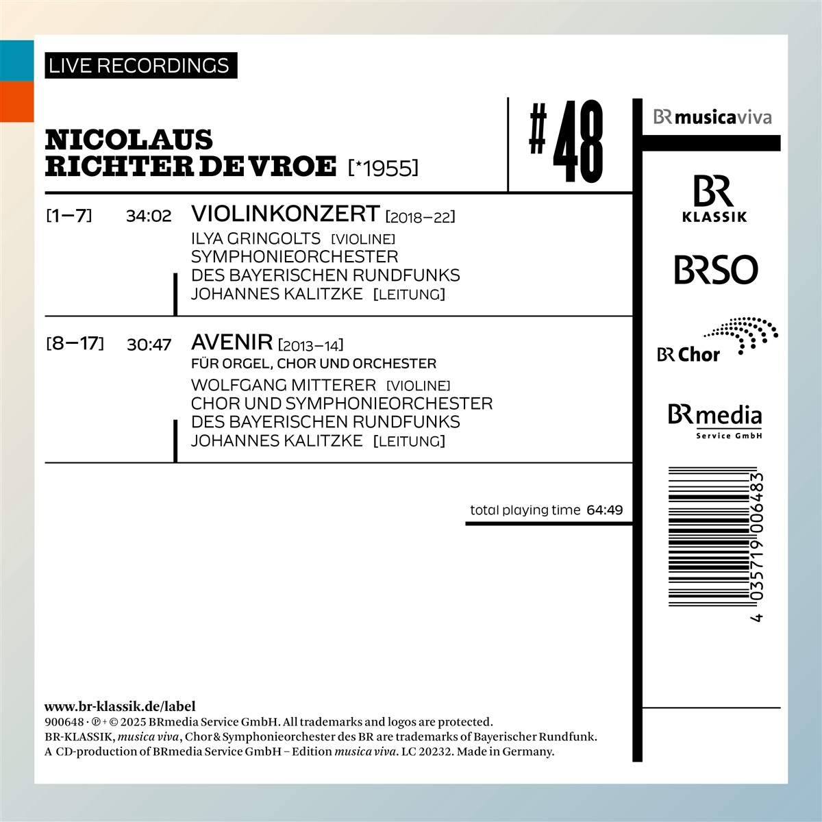 Die Werke des Violinisten und Komponisten Nicolaus Richter de Vroe (*1955) kamen und kommen regelmäßig bei den renommiertesten Veranstaltern und Festspielen für Neue Musik zur Aufführung. Richter de Vroe wurde in Dresden und Moskau ausgebildet und wurde schließlich Mitglied der Staatskapelle Berlin und schloss sein Kompositionsstudium an der Akademie der Künste der DDR ab. 1982 gründete er das Ensemble für Neue Musik Berlin (Ost), das sich rasch zu einem bedeutenden Forum für avancierte Musik in der DDR entwickelte. Seit Mitte der 1980er-Jahre ist Richter de Vroe mit Aufführungen seiner Werke und als Interpret bei sämtlichen ARD-Rundfunkanstalten sowie auf internationalen Festivals präsent. 1988 wurde er Mitglied des Symphonieorchesters des Bayerischen Rundfunks; ein Jahr später gründete er das XSEMBLE München – ein Ensemble, das sich durch experimentelle Programmgestaltung und stilistische Offenheit auszeichnet. Sein Violinkonzert entstand zwischen 2018 und 2020 als Kompositionsauftrag der musica viva des Bayerischen Rundfunks und wurde 2022 unter Leitung von Johannes Kalitzke und mit dem Violinisten Ilya Gringolts uraufgeführt – das ist die hier vorliegende Aufnahme.