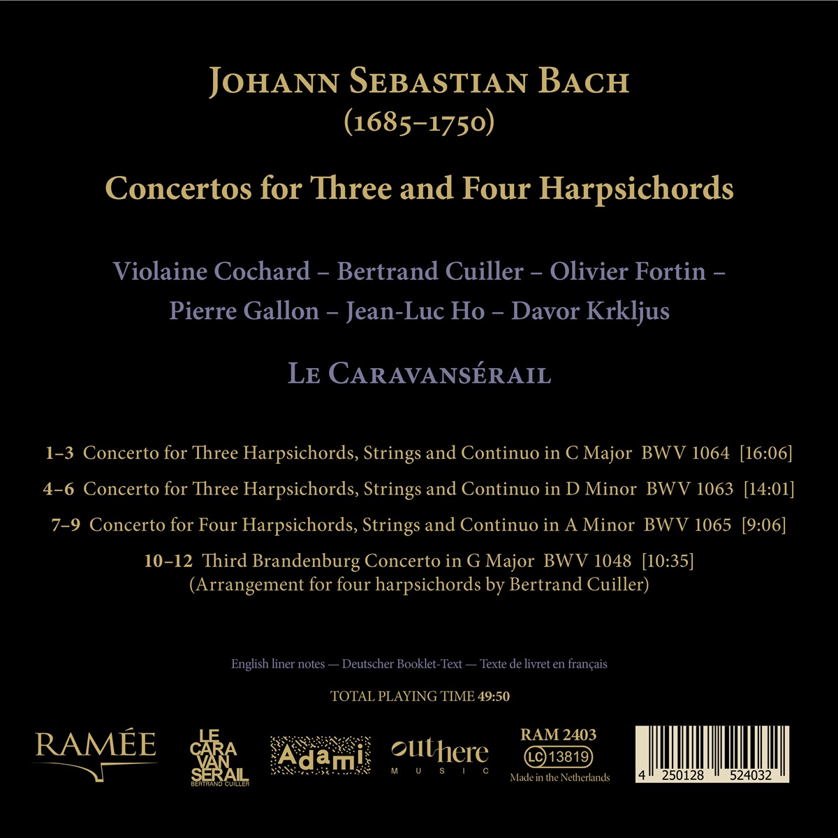 Diese selten eingespielten Konzerte für drei und vier Cembali von Johann Sebastian Bach sind ein Beispiel für die Kunst des Komponierens für Tasteninstrumente und Streicher, für die der Komponist eine Vorreiterrolle spielte. Diese emblematischen Werke, die sich durch ein Gleichgewicht zwischen starken Themen und einer überbordenden inneren Dynamik auszeichnen, werden von virtuosen Cembalisten der neuen Generation von Barockmusikern interpretiert: Violaine Cochard, Olivier Fortin, Pierre Gallon, Jean-Luc Ho und, zum ersten Mal, der junge kroatische Cembalist Davor Krkljus, begleitet von den Streichern Le Caravansérail unter der Leitung von Bertrand Cuiller am Cembalo. Dieses Album enthält außerdem ein bisher unveröffentlichtes Stück, eine Transkription des berühmten Brandenburgischen Konzerts Nr. 3 für vier Cembali, die von Bertrand Cuiller angefertigt wurde.