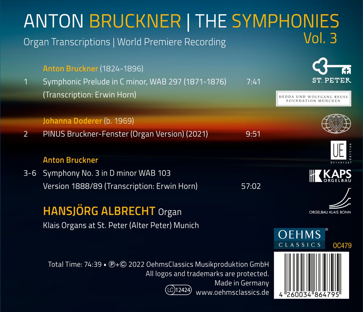 Hansjörg Albrecht spielt anlässlich des nahenden Bruckner-Jahres 2024 in neuen Orgel-Transkriptionen sämtliche Sinfonien Bruckners ein. Das vierte Album der Reihe entstand an der beeindruckenden Orgel von St. Peter in München. Ergänzt wird dieser spezielle Blick auf Bruckners Sinfonik stets durch zeitgenössische Werke, die sich aus heutiger Sicht dem Werk Bruckners nähern. In diesem Fall reflektiert die Komponistin Johanna Doderer mit ihrem „Bruckner-Fenster IV“ in einer Orgelfassung über den Klangkosmos Bruckners.