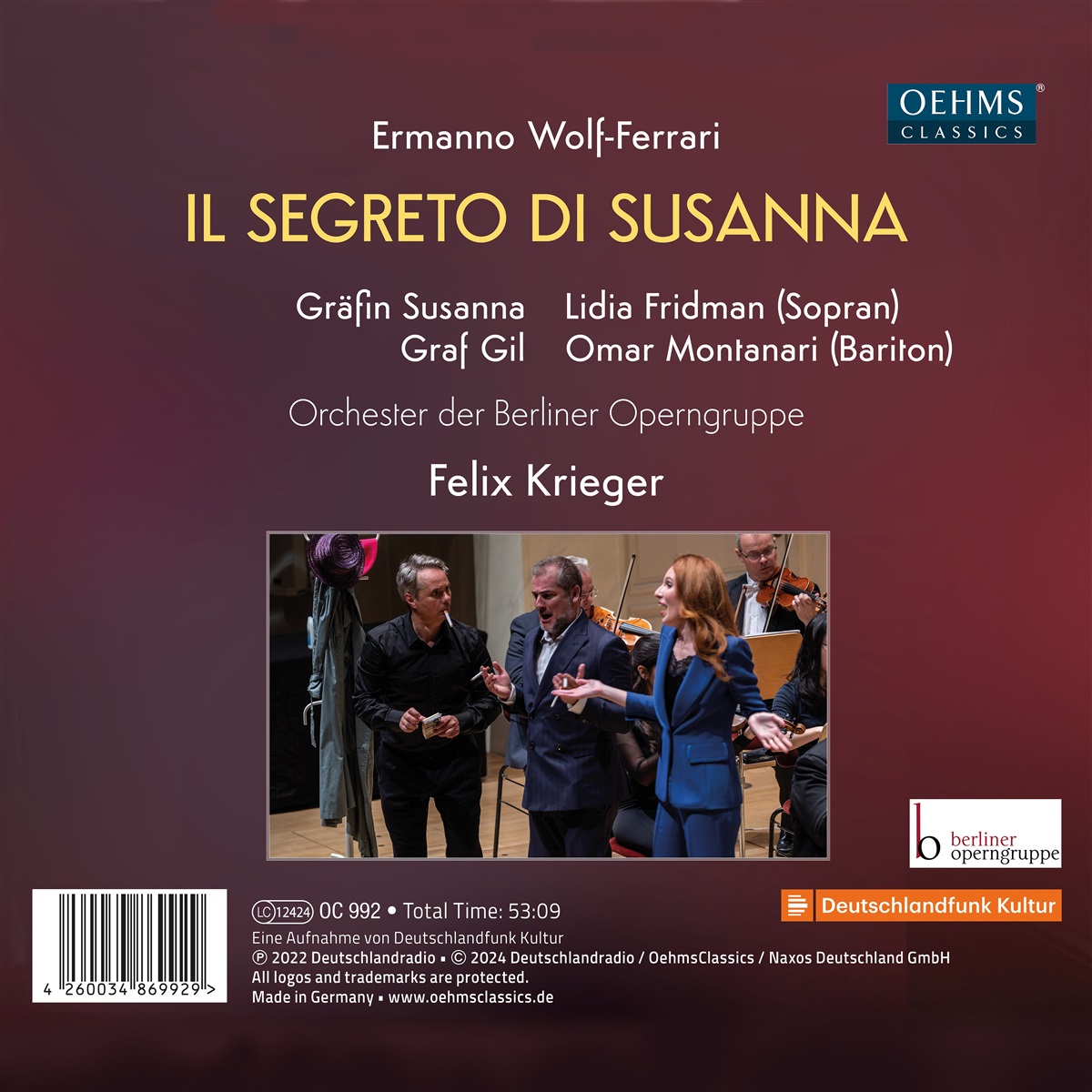 Die Berliner Operngruppe hat sich seit Ihrem Bestehen 2013 einen Namen mit Berliner Erstaufführungen wie Donizettis „Deux Hommes et une Femme“ und „Betly“ und anderen Opern-Raritäten gemacht. Dieses Album ist ein Mitschnitt der Aufführung von Wolf-Ferraris komischer Oper „Il segreto di Susanna“ aus dem Konzerthaus Berlin aus 2021, aufgezeichnet vom Deutschlandfunk Kultur. Das Orchester der Berliner Operngruppe spielt unter der Leitung von Felix Krieger. Es singen Lidia Fridman und Omar Montanari.