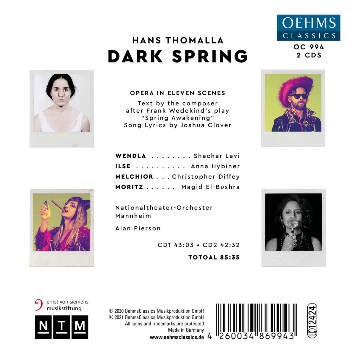 „Dark Spring“ ist eine Oper über vier junge Menschen unter extremen Druck: dem Leistungsanspruch in Schule oder Studium, dem Erfolgsdruck im Popularitätsranking des Freundeskreises und nicht zuletzt dem Druck zu einer perfekten Performance in Sexualität und Intimität. Im Zentrum der Oper steht weniger eine lineare Handlung, sondern vielmehr der Versuch in Songs die widersprüchlichen Gefühle zu artikulieren. Durch die Formalisierung der statischen Liedstrukturen bricht immer wieder eine rohe, ungeformte Klanglichkeit durch, eine undomestizierte akustische Welt aus Geräusch, Lärm, Schrei und Stille, die einen Ausbruch aus den Normen und Ansprüchen symbolisiert.