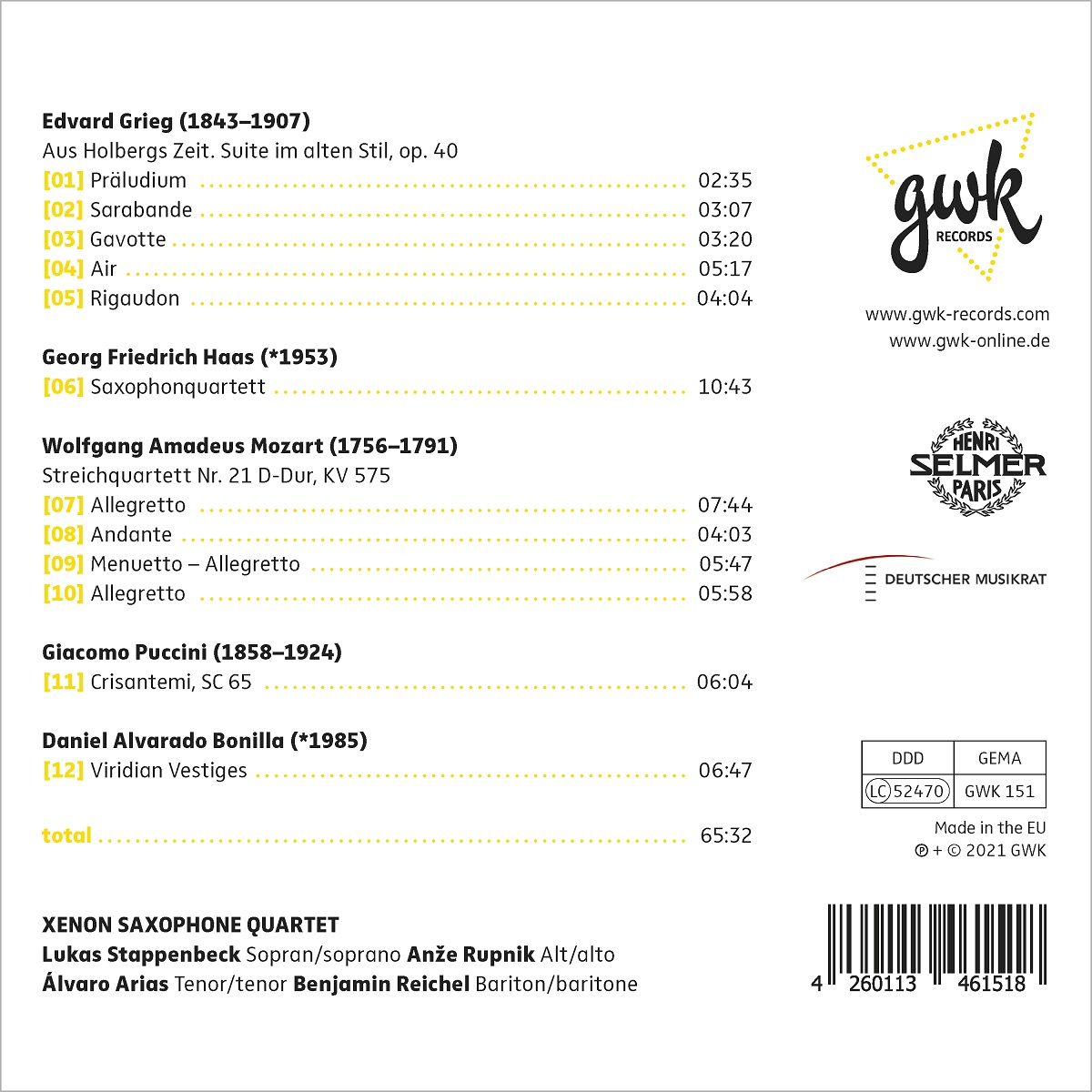 Spannungsvoll, entdeckerfreudig und risikobereit, ohne Furcht vor Schönklang und Komplexität, mit viel Lust am Schrägen kombiniert das preisgekrönte Saxophonquartett XENON auf seiner De-but-CD „Dedicated to“ klassische Werke, die ursprünglich für Streicher geschrieben wurden, mit Originalkompositionen für Saxophonquartett aus dem 21. Jahrhundert. Der Ersteinspielung von „Viridian Vestiges“, das der 35-jährige kolumbianisch-französische Komponist Daniel Alvarado Boni-lla für Xenon schrieb, sowie der europäischen Ersteinspielung des Saxophonquartetts von Georg Friedrich Haas (*1953), einem der bedeutendsten Spektralisten, stellt das junge Ensemble Griegs Holberg-Suite, Mozarts Streichquartett Nr. 21 in D-Dur und Puccinis „Crisantemi“ gegenüber. Mit Mitgliedern renommierter Streichquartette erarbeitete sich Xenon Klang- und Phrasengestaltung sowie Artikulation – auch, um auf seinen „falschen“ Instrumenten für alte Werke ein neues Hörer-lebnis zu kreieren. „Wir wollen zeigen,“ so heißt es im sehr informativen Booklet, „welche Nuancen, die man vielleicht so noch nicht gehört hat, in den alten Stücken stecken. Nur deshalb macht es Sinn, sie mit Saxophonquartett zu spielen.“ Die ausgewählten Werke verbindet der Widmungsge-danke, wobei ihre Widmung die jeweilige Komposition beeinflusst hat. Mozart z.B. brachte die Cel-lostimme, die das Baritonsaxophon übernimmt, in seinem Quartett so prominent wie die Geigen-stimme, weil der preußische König leidenschaftlich gern Cello spielte und Mozart ihn als Sponsor gewinnen wollte. Oder Alvarado Bonilla transformiert Miles Davis’ Jazzstandard „Blue in Green“ in seinen „Viridian Vestiges“, weil ihm bei dem Stück das nahezu impressionistische, subtil-floatende und melancholische Klavierspiel von Bill Evans nahegegangen ist.