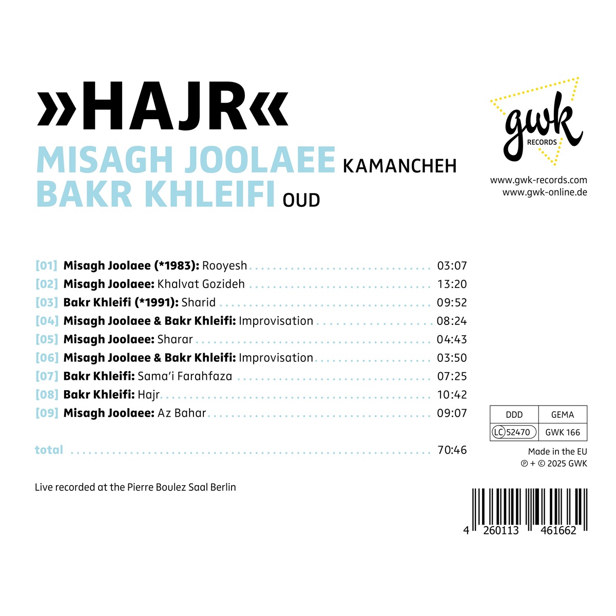 Weltmusik als Kunstmusik, die in Bann zieht und aufmerken lässt: „Hajr“ ist ein intimer Dialog zweier alter Musiktraditionen – in einer neuen und originellen, farben- und abwechslungsreichen, mitreißend aktuellen Musiksprache. Die Musikkultur des jeweils anderen fasziniert den palästinensischen Oudisten Bakr Khleifi und den aus dem Iran stammenden Kamancheh-Musiker Misagh Joolaee, und beide Virtuosen inspirieren einander zu etwas Gemeinsamem, Neuem. Die Musiker, die sich in Berlin kennenlernten, wuchsen in der europäischen klassischen und der klassischen Tradition ihrer Herkunftsländer auf. Als Duo erkunden sie mit den Eigenkompositionen und Improvisationen ihres Debut-Albums „Hajr“ Verbindungen und Unterschiede zwischen persischer und arabischer Musik. In ihren Stücken verwenden sie z. B. Skalen und vielfältige komplexe Rhythmen, arbeiten Einflüsse aus Barock, Jazz und Flamenco ein. Zudem entdecken sie neue Ausdrucksmöglichkeiten für ihre Instrumente und entwickeln spezielle Spieltechniken für sie. Wie das Album insgesamt – „Hajr” bedeutet auf Arabisch „verlassen, sich zurückziehen” – tragen die einzelnen Stücke poetische Titel, die die Imagination der Zuhörenden nicht definieren, sondern anstoßen, öffnen und beflügeln. Dabei beschwören Joolaee-Khleifi musikalisch diverse Atmosphären, Stimmungen, Gefühle und innere Bilder herauf, die ihnen entsprechen, etwa vom Aufkeimen der Saat („Rooyesh“) oder vom Frühling („Az Bahar“), von einem Wanderer, der auf einer langen Suche ist („Sharid“), oder einem Ort, den man verlassen hat („Hajr“). Das Album ist der Live-Mitschnitt des umjubelten Debut-Konzerts von Misagh Joolaee und Bakr Khleifi im Pierre Boulez Saal in Berlin im Jahr 2024.