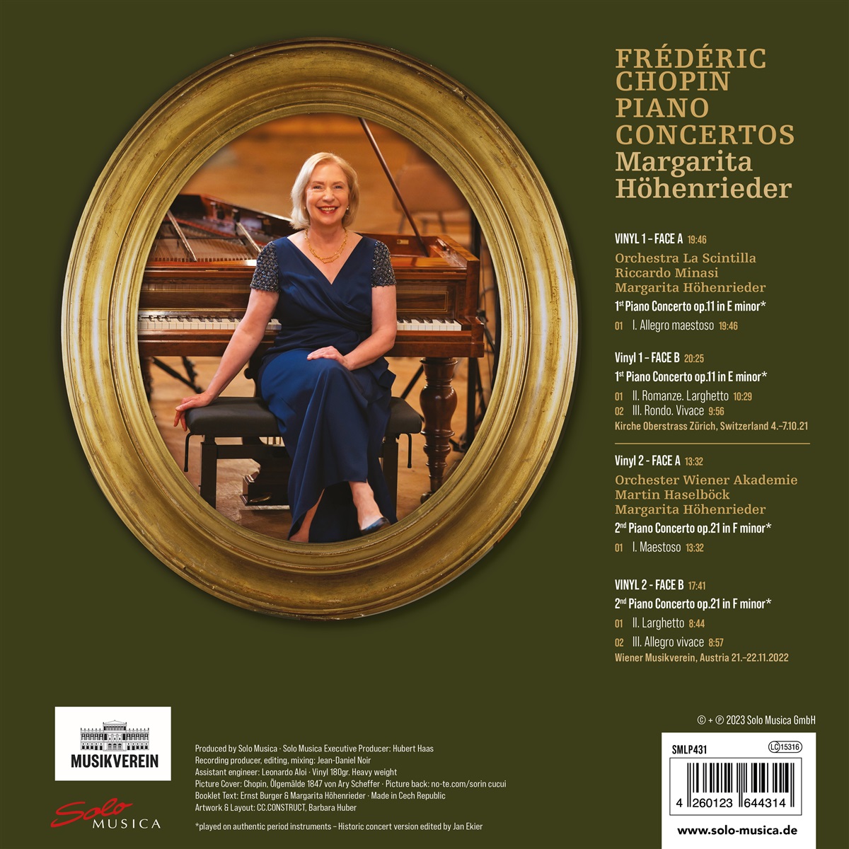 Auf der Suche nach dem authentischen Klangerlebnis der Klavierwerke von Frédéric Chopin fiel Margarita Höhenrieders Instrumenten-Wahl auf einen Pleyel von 1948, also einem Klavier, das dem Pleyel Chopins sehr ähnlich ist. Die Instrumente der Pariser Klavierbauer-Dynastie stellten für Chopin „das Nonplusultra“ dar. Die Orchester „La Scintilla“ unter der Leitung von Riccardo Minasi sowie die Wiener Akademie unter Martin Haselböck spielen selbstredend auf historischen Instrumenten. Ebenso wurden die Aufnahmeorte sorgfältig nach dem Charakter der Konzerte ausgewählt: die Kirche Oberstrass in Zürich (op. 11) und der Wiener Musikverein (op. 21). Das Ergebnis ist ein historischer Klang, der dem ‚Sound‘ Chopins vermutlich sehr nahe kommt.