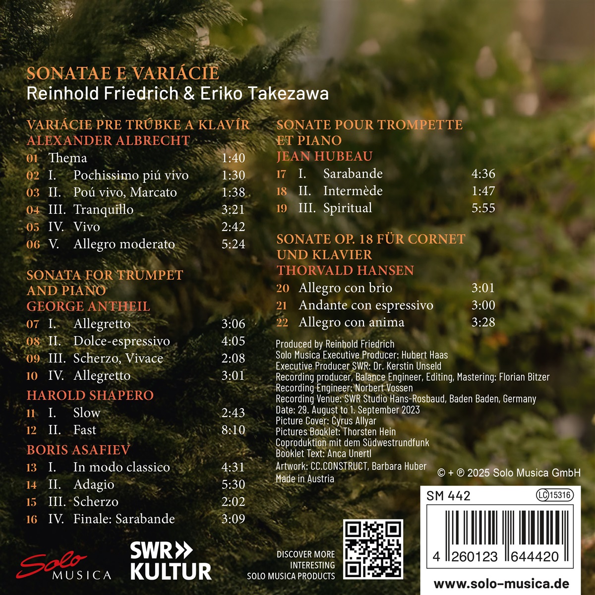 Das herausragende konzertante Duo Reinhold Friedrich & Eriko Takezawa erweckt auf seinem nunmehr dritten Album, was bisher im Verborgenen geschlummert hat oder noch nicht in verdient glanzvollem Licht erschienen ist. Die beiden Ausnahmekünstler präsentieren in ihrer neuen Produktion drei Neuentdeckungen von Alexander Albrecht, Boris Asafiew und Harold Shapero, welche für das Repertoire Trompete-Klavier von höchster Bedeutung sind. Bemerkenswert sind auch die drei wichtigen Repertoirewerke, die Sonaten von Thorwald Hansen, Jean Hubeau und George Antheil, die hier in völlig neuem Glanz erstrahlen. Die Werke sind alle am Ende der Romantik bis zum Übergang in die Moderne angesiedelt. Man kann auch jetzt schon von einer historisch wichtigen Aufnahme sprechen, da es die letzte Audio-Produktion im „alten“ Hans Rosbaud-Studio in Baden-Baden vor dem Abriss des Gebäudes ist. Dieser akustisch so wertvolle Raum war Heimat von den großen und größten Komponisten unserer Zeit - von Olivier Messiaen bis Jörg Widmann, von Bernd Alois Zimmermann und Karlheinz Stockhausen bis hin zu Peter Eötvös und Wolfgang Rihm. Dieses Album „Sonatae e Variácie“ hat durchaus das Potential, ein Meilenstein im Repertoire für Trompete und Klavier zu werden.