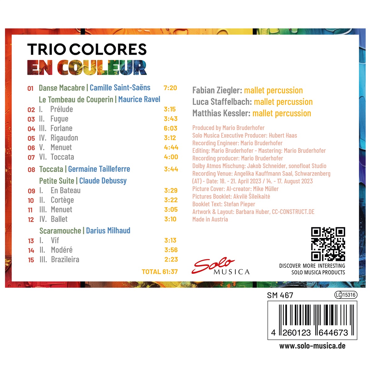 Wenn Matthias Kessler (*1997), Luca Staffelbach (*1996) und Fabian Ziegler (*1995) die Werke französischer Komponisten musizieren, kommen bis zu 2 Marimbas, 3 Vibraphone und 2 Glockenspiele zum Einsatz - manchmal mehr, manchmal weniger. Fünf Jahre Entwicklungsarbeit haben sich die drei Schweizer und Österreichischen Musiker für ihr Debütalbum erlaubt. Der gemeinsame Nenner dabei: Eine große Lust auf die Erkundung des unendlichen Potenzials von Schlaginstrumenten. Den Weg dafür hat den drei jungen Musikern ihr Bachelorstudium an der Zürcher Hochschule der Künste eröffnet, in dem von Anfang an das ganze Spektrum instrumentaler Möglichkeiten gleichberechtigt vertreten war – also nicht nur die riesige Vielfalt der Trommeln und sonstiger Percussion, sondern eben auch die sogenannten ‚Mallet-Instrumente‘. Mallet heißt Schlägel – Marimbas und Vibraphone werden in der Regel gleich mit zwei pro Hand gespielt. Dabei wächst das Schlagwerk über seine Rolle als reines Rhythmusinstrument hinaus und emanzipiert sich als vollwertiges, melodisches und klangmalerisches Instrument. Mittlerweile haben sich Mallet-Besetzungen als äußerst beliebte Gattung in Wettbewerben und im Konzertleben etabliert. Matthias Kessler, Luca Staffelbach und Fabian Ziegler erfahren eine begeisterte Resonanz bei ihren Konzerten, wo das Publikum von der Vielfalt der Instrumente immer wieder beeindruckt ist. Neben dem ganzen Effektreichtum verblüfft die hohe Synchronizität in diesem jungen Trio. Alles wirkt oft, wie von einem einzigen Instrument gespielt. Der Wunsch der drei jungen Musiker besteht in noch mehr Selbstverständlichkeit bei der Wahrnehmung dieser Besetzung. So sollte doch künftig immer weniger ein spektakulärer Exotenstatus im Vordergrund stehen, sondern nur mehr die musikalische Qualität und Tiefe: ‚Wir wünschen uns, dass vielleicht in fünf oder zehn Jahren die Leute aus einem Konzert mit Marimbas und Vibraphonen genauso wie aus einem Klavierabend herausgehen und nicht nur einfach sagen, das war jetzt eine tolle Show‘, formuliert Matthias das Anliegen für die Zukunft. Und das wiederum soll auch durch dieses Album-Debüt bekräftigt werden.