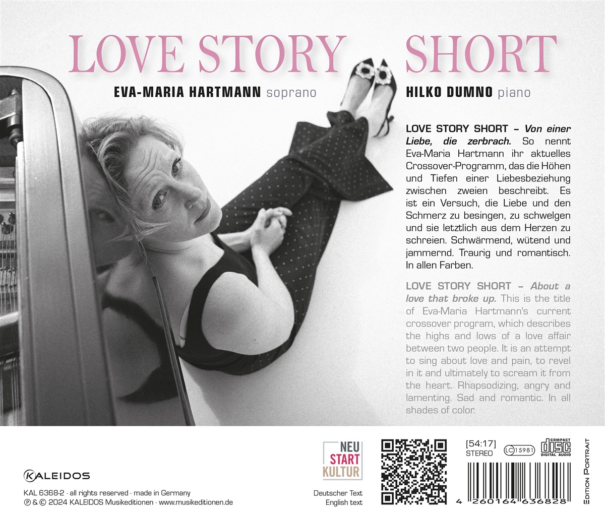 LOVE STORY SHORT – Von einer Liebe, die zerbrach. So nennt Eva-Maria Hartmann ihr aktuelles Crossover-Programm, das die Höhen und Tiefen einer Liebesbeziehung zwischen zweien beschreibt. Es ist ein Versuch, die Liebe und den Schmerz zu besingen, zu schwelgen und sie letztlich aus dem Herzen zu schreien. Schwärmend, wütend und jammernd. Traurig und romantisch. In allen Farben.
