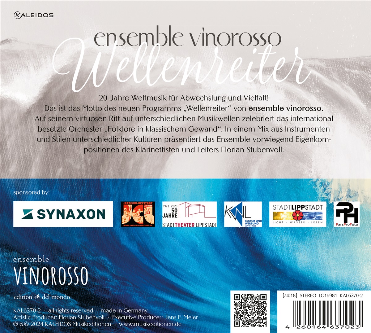 20 Jahre Weltmusik für Abwechslung und Vielfalt – das ist das Motto des neuen Programms „Wellenreiter“ von ensemble vinorosso. Auf seinem virtuosen Ritt auf unterschiedlichen Musikwellen zelebriert das international besetzte Orchester „Folklore in klassischem Gewand“. In einem Mix aus Instrumenten und Stilen unterschiedlicher Kulturen präsentiert das neue Programm vorwiegend Eigenkompositionen des Klarinettisten und Leiters des Ensembles Florian Stubenvoll.