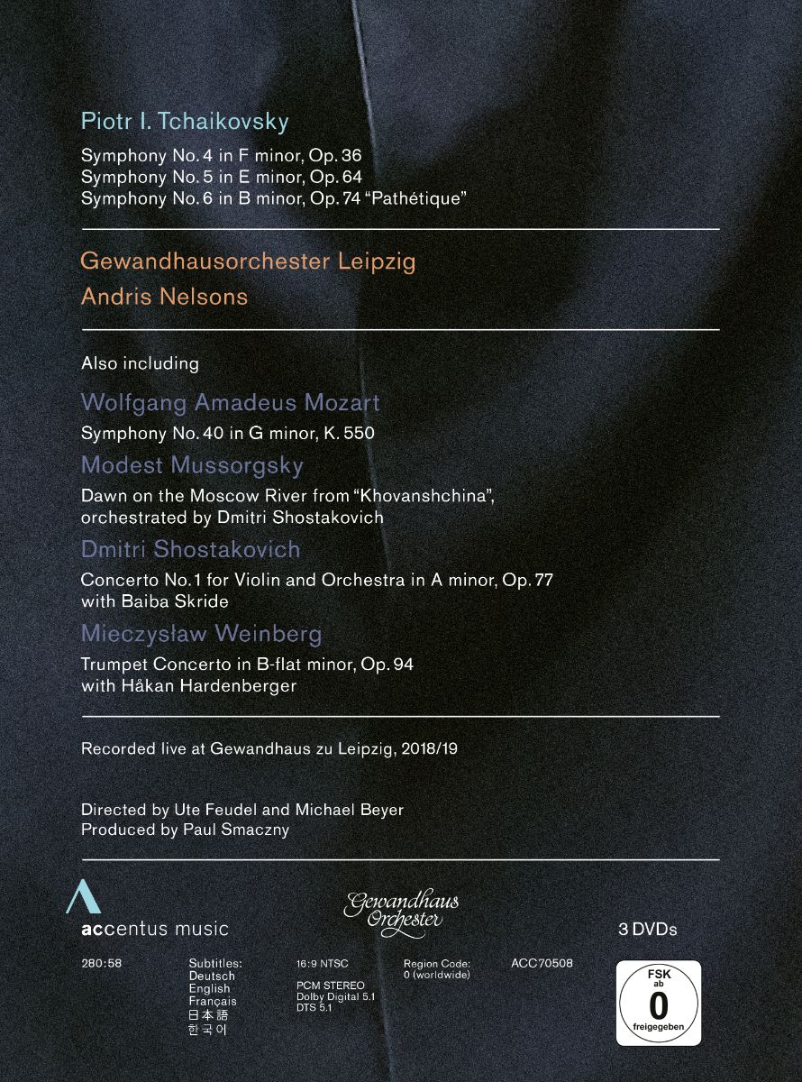 Dieses Box-Set vereint die bereits separat veröffentlichten Videoaufzeichnungen von Tschaikowskys Sinfonien 4, 5 und 6 mit dem Gewandhausorchester Leipzig unter der Leitung von Andris Nelsons, aufgenommen in 2018 und 2019. Ergänzt werden die drei großen Sinfonien durch Werke von Mozart (Sinfonie Nr. 40 in g-Moll, KV 550), Mussorgsky („Morgendämmerung an der Moskwa" aus „Chowanschtschina“, orch. von D. Sch.), Schostakowitsch (Violinkonzert Nr. 1 in a-Moll, op. 77, Solistin: Baiba Skride) und Weinberg (Trompetenkonzert in B-Dur, op. 94, Solist: Håkan Hardenberger). Es sind allesamt musikalische Sternstunden, die die ‚russische Seele‘ des Gewandhausorchesters eindrucksvoll unter Beweis stellen.