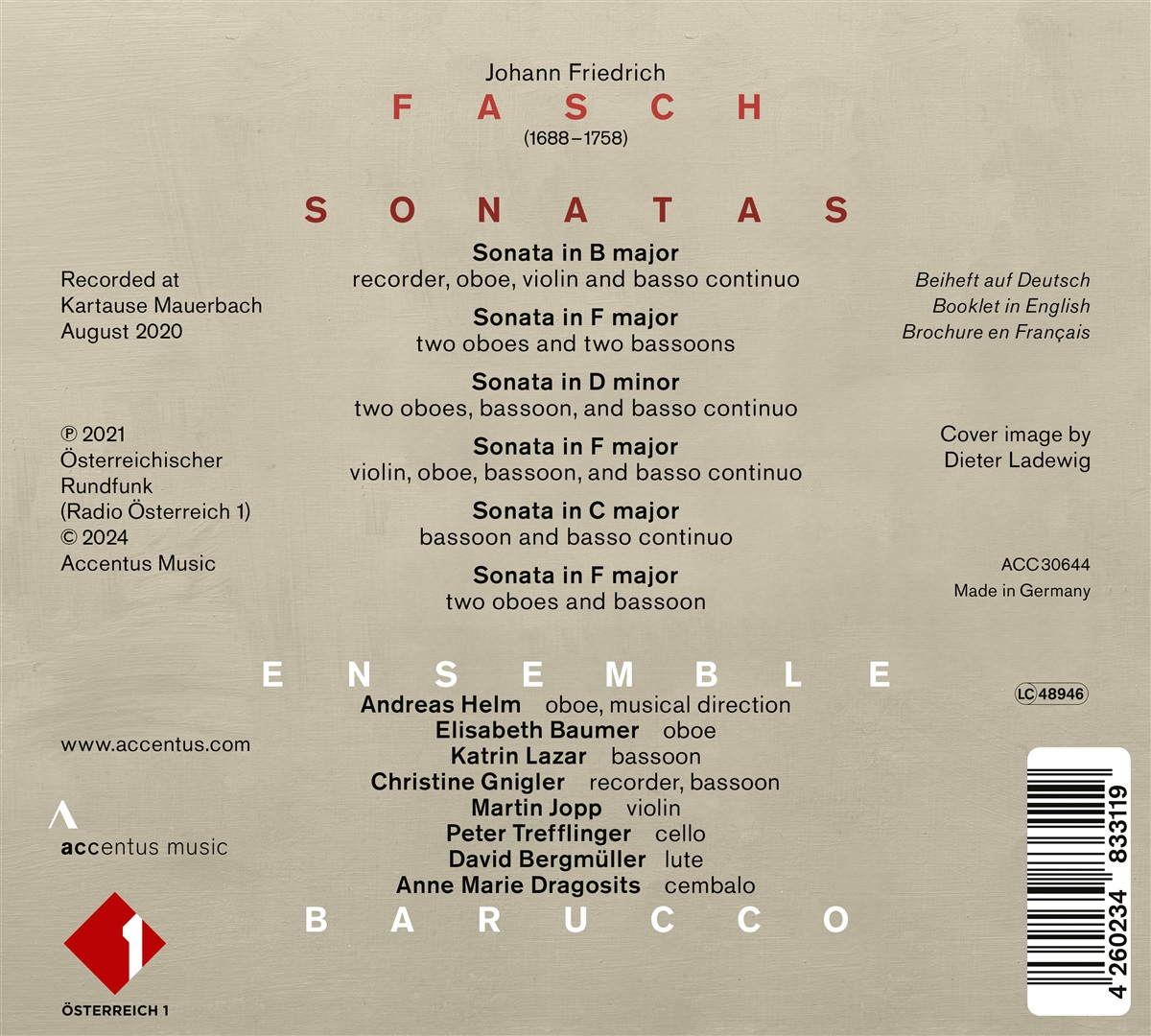 Das vorliegende Album mit Sonaten von Johann Friedrich Fasch, interpretiert vom österreichischen Ensemble Barucco, präsentiert eine fesselnde Sammlung kammermusikalischer Barock-Edelsteine. Fasch, der bereits als Komponist bekannt war, bevor er 1722 die prestigeträchtige Stelle des Hofkapellmeisters in Anhalt-Zerbst antrat, hat die musikalische Landschaft des Barock entscheidend mitgeprägt. Diese sorgfältig zusammengestellte Sammlung präsentiert sowohl die komplexen Strukturen als auch den melodischen Reichtum seiner Sonaten, wobei jedes Stück Faschs innovativen Kompositionsansatz widerspiegelt.