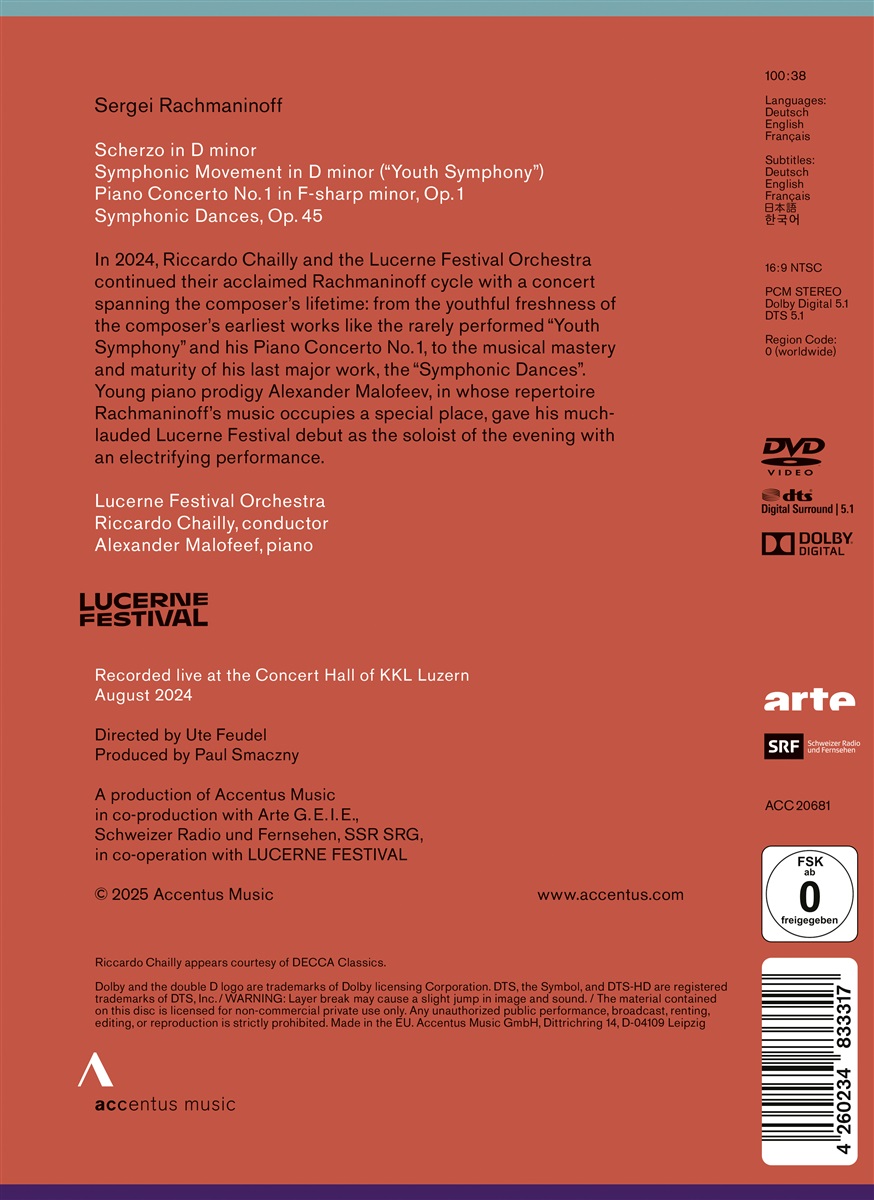 2024 setzten Riccardo Chailly und das Lucerne Festival Orchestra ihren gefeierten Sergei-Rachmaninow-Zyklus mit einem Konzert fort, das das gesamte Schaffen des Komponisten umfasste: von der jugendlichen Frische seiner frühesten Werke wie der selten aufgeführten Ersten Sinfonie und seinem Klavierkonzert Nr. 1 bis hin zur musikalischen Meisterschaft und Reife seines letzten großen Werks, den „Sinfonischen Tänzen“. Der junge Klaviervirtuose Alexander Malofeev, in dessen Repertoire Rachmaninows Musik einen besonderen Platz einnimmt, gab sein vielbeachtetes Debüt beim Lucerne Festival als Solist des Abends mit einer mitreißenden Darbietung zusammen mit dem Lucerne Festival Orchestra unter der Leitung von Riccardo Chailly. Das Konzert wurde im August 2024 live in der Konzerthalle des KKL Luzern aufgenommen.