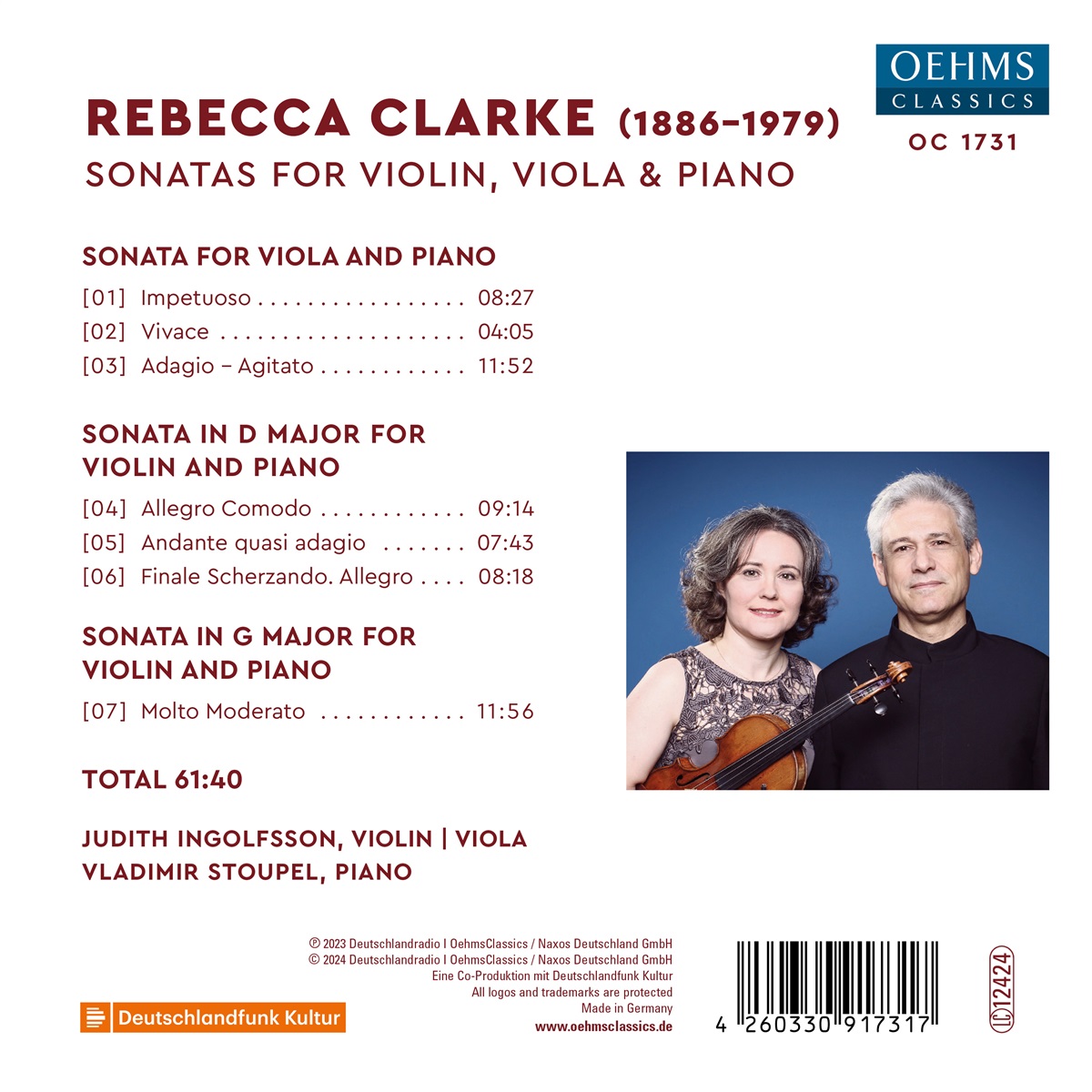 Die aus London stammende Bratschistin, Violinistin und Komponistin Rebecca Clarke hat ein breites Schaffen hinterlassen. Insbesondere Ihre Lieder und Kammermusikwerke ragen heraus. Obwohl ihre Werke nach dem 2. Weltkrieg im sich radikal wandelnden Zeitgeschmack an Bedeutung verloren, erlebte ihr Werk in den 1970er Jahren eine Renaissance. Ihre Musik erhält derzeit durch die verstärkte Beachtung der Musik von Komponistinnen eine dritte Welle an Aufmerksamkeit und etabliert sie als wichtige Stimme der britischen Musik des 20. Jahrhunderts. Beim aufmerksamen Hören dieses Albums begibt man sich auf eine Reise durch die kompositorische Eloquenz und Tiefgründigkeit von Rebecca Clarkes musikalischem Universum.
