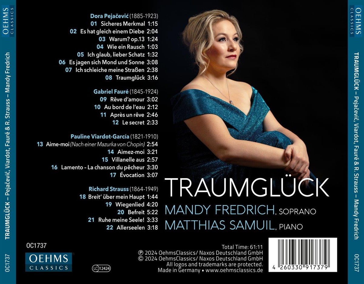 Das Album „Traumglück“ von Mandy Fredrich versammelt eine Reihe von Kunstliedern, die zusammenhängende Bögen erschaffen und längere Handlungsabläufe wie in einer Art Mini-Oper entwerfen. Mit den Liedern der Komponistinnen und Komponisten wurden vier Geschichten über Liebespaare zusammengestellt, die alle um das Thema ‚Traumglück‘ in seinen unterschiedlichsten Facetten kreisen. Nach Ihrem Durchbruch in der Rolle der Königin der Nacht bei den Salzburger Festspielen unter Nikolaus Harnoncourt folgten für die Sopranistin Engagements am Teatro alla Scala in Mailand, New National Theatre Tokio, Opernhaus Zürich, an der Deutschen Oper Berlin, bei den Staatsopern in München und Hamburg sowie bei den Bregenzer Festspielen. Matthias Samuil ist Mandy Fredrichs langjährige Liedbegleiter.