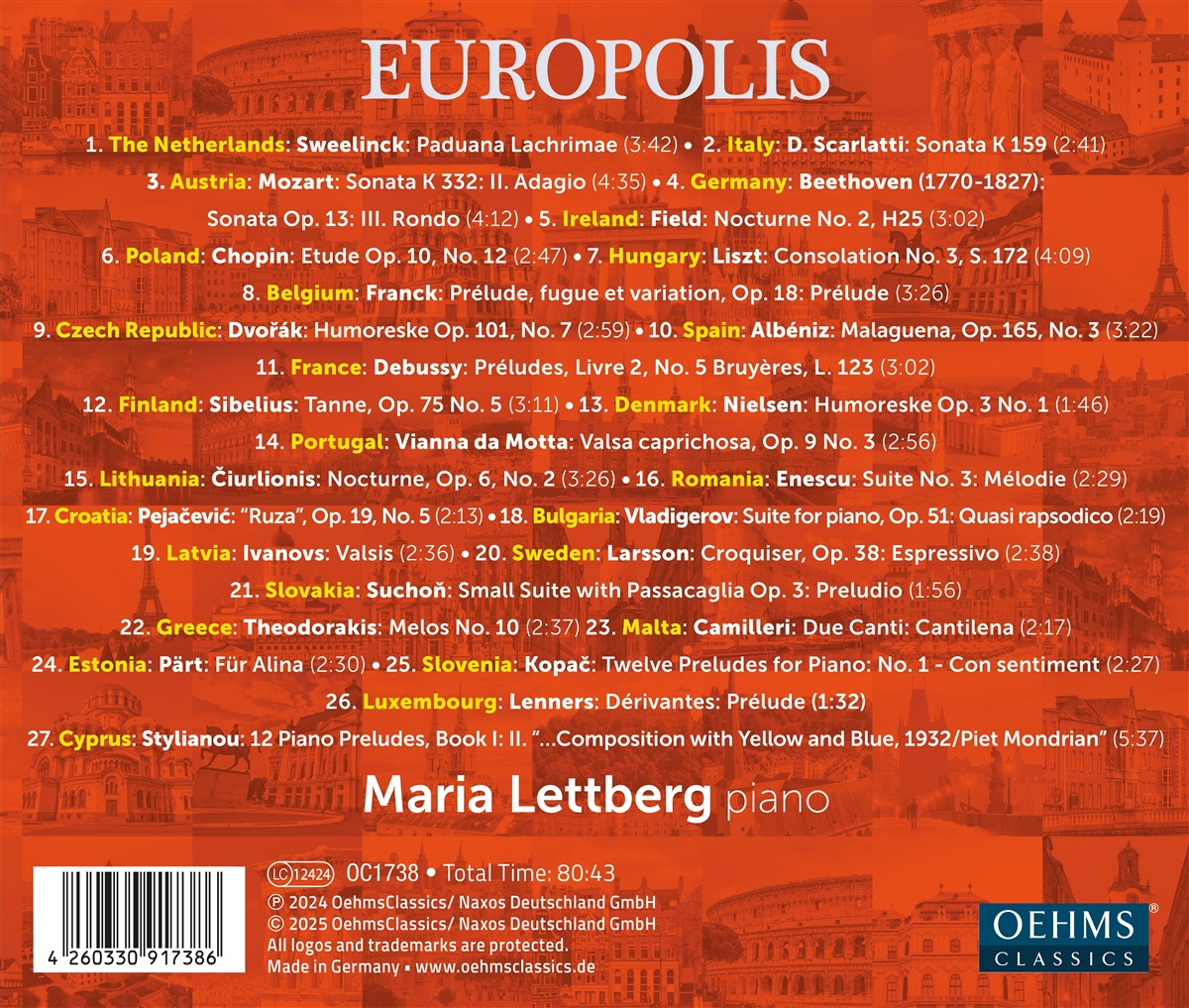 Auf dem Album „Europolis“ begibt sich die Pianistin Maria Lettberg auf die musikalische Reise durch die 27 Länder der europäischen Union. Sie wählte jeweils ein Werk pro Land und ordnete diese chronologisch an. Somit sie in „Europolis“ (fast) alle bedeutenden Stile der klassischen Musik vertreten, beginnend von der Renaissance und dem Barock über Wiener Klassik und Romantik bis hin zur Musik des 20. und 21. Jahrhunderts, vom Niederländer Jan Pieterszoon Sweelinck bis zum zeitgenössischen zypriotischen Komponisten Constantinos Stylianou.