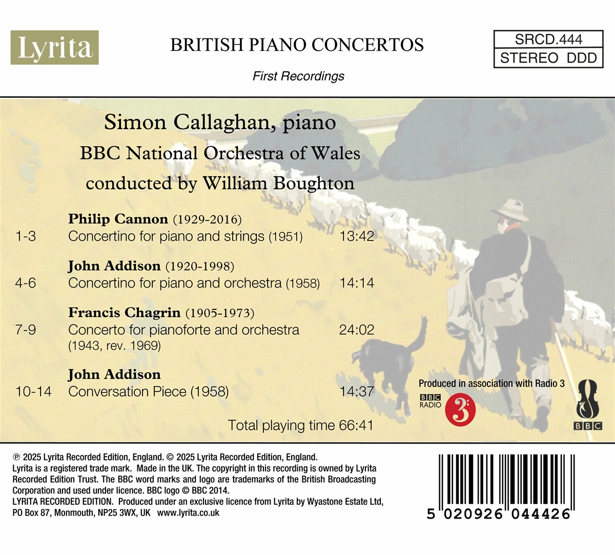 Philip Cannons lebhaftes, neoklassisches „Concertino“ für Klavier und Streicher wurde für das Petersfield Festival geschrieben und 1951 vom Solisten Joseph Cooper mit dem Petersfield Orchestra unter der Leitung von Kathleen Merritt uraufgeführt, es folgten international über tausend weitere Aufführungen. Obwohl John Addisons „Concertino“ für Klavier und Orchester größtenteils in einer unbeschwerten Sprache gehalten ist, ist es das Produkt einer ernsthaften und stets erfinderischen Herangehensweise an das Schreiben für Klavier und Orchester. Francis Chagrin hatte eine sehr praktische und unprätentiöse Einstellung zu seinem eigenen Handwerk – es sei einfach zum Spielen gedacht. Sein Klavierkonzert wurde 1944 bei einer SPNM-Experimentalprobe am Royal College of Music vom Solisten Franz Osborn mit dem London Symphony Orchestra unter der Leitung des Komponisten uraufgeführt. „Conversation Piece“ von John Addison wurde 1958 im Auftrag des BBC Concert Orchestra für das British Light Music Festival des Jahres geschrieben. John Addison war der Meinung, dass sich Ende der 1950er Jahre eine zu große Kluft zwischen ernster und Unterhaltungsmusik aufgetan hatte: ‚Ich erinnere mich an das erstaunte Aufatmen, als ich im Rahmen der Einführung eines meiner Kammermusikwerke dem Publikum mitteilte, dass es mir nichts ausmachen würde, wenn sie lächeln würden.‘ In „Conversation Piece“ schöpft Addison sein Talent für Unterhaltung und Witz voll aus.