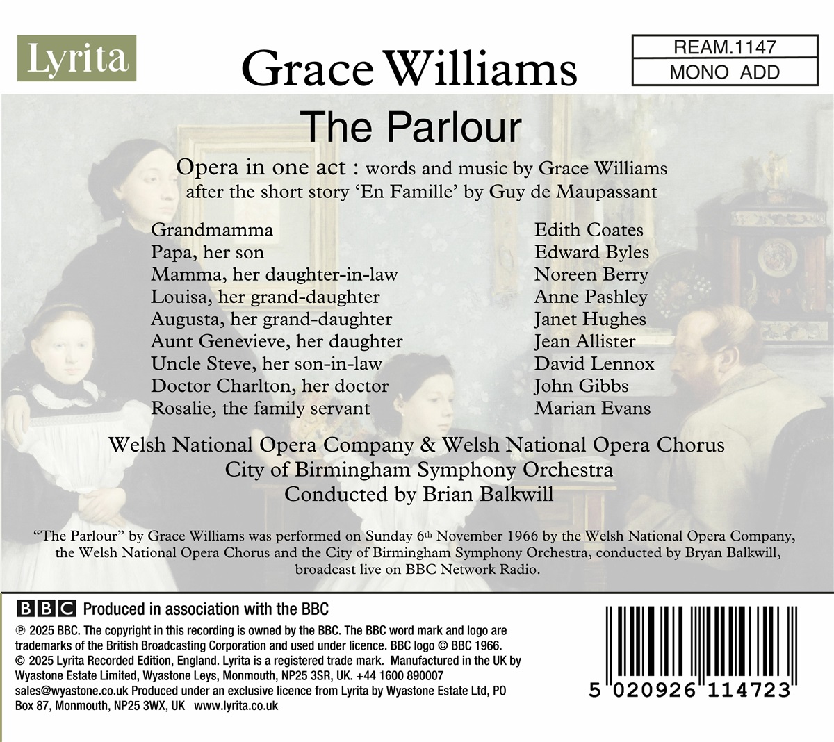 Als das walisische Komitee des Arts Council im Sommer 1959 an Grace Williams herantrat und ihr einen Auftrag für eine Einakter-Oper anbot, war dies für sie die Gelegenheit, einen lang gehegten Traum zu verwirklichen. Als Vorlage für ihr Libretto wählte die Komponistin die bissig-komische Novelle „En Famille“ des französischen Satirikers Guy de Maupassant, in der der scheinbare Tod einer streitsüchtigen Matriarchin die Gier der Familienmitglieder offenbart. Sie schrieb ihr eigenes Libretto für „The Parlour“, wobei sie Maupassants Geschichte für dramatische Zwecke ausschmückte und überarbeitete und den Schauplatz von den Ufern der Seine in Frankreich in das Wohnzimmer eines Hauses in einer viktorianischen Küstenstadt verlegte. Das Drama, das in zwei Szenen mit einem kurzen Zwischenspiel gegliedert ist, spielt an einem Sommertag im Jahr 1870. „The Parlour“ offenbart Grace Williams als eine begnadete Komponistin für das Theater mit einem Gespür für Charakterzeichnung und -entwicklung. Das schnelle Tempo lässt keine Zeit für eine formelle Ouvertüre, und das Drama beginnt ohne Vorwort. Die kompakten Arien, Ensembles, Rezitative und Chöre ergeben sich ganz natürlich aus der durchgehenden Musik, und es gibt keine langen Nummern, die den Erzählfluss behindern. Wie die Komponistin selbst zugab: „In kurzer Zeit gibt es viel zu sagen. Was auch immer man mir sonst vorwerfen mag, ich glaube kaum, dass jemand sagen könnte, die Oper ziehe sich in die Länge.“ Bei seiner Uraufführung wurde „The Parlour“ von einem begeisterten Publikum mit lang anhaltendem Beifall bedacht und erhielt einige sehr gute Kritiken.