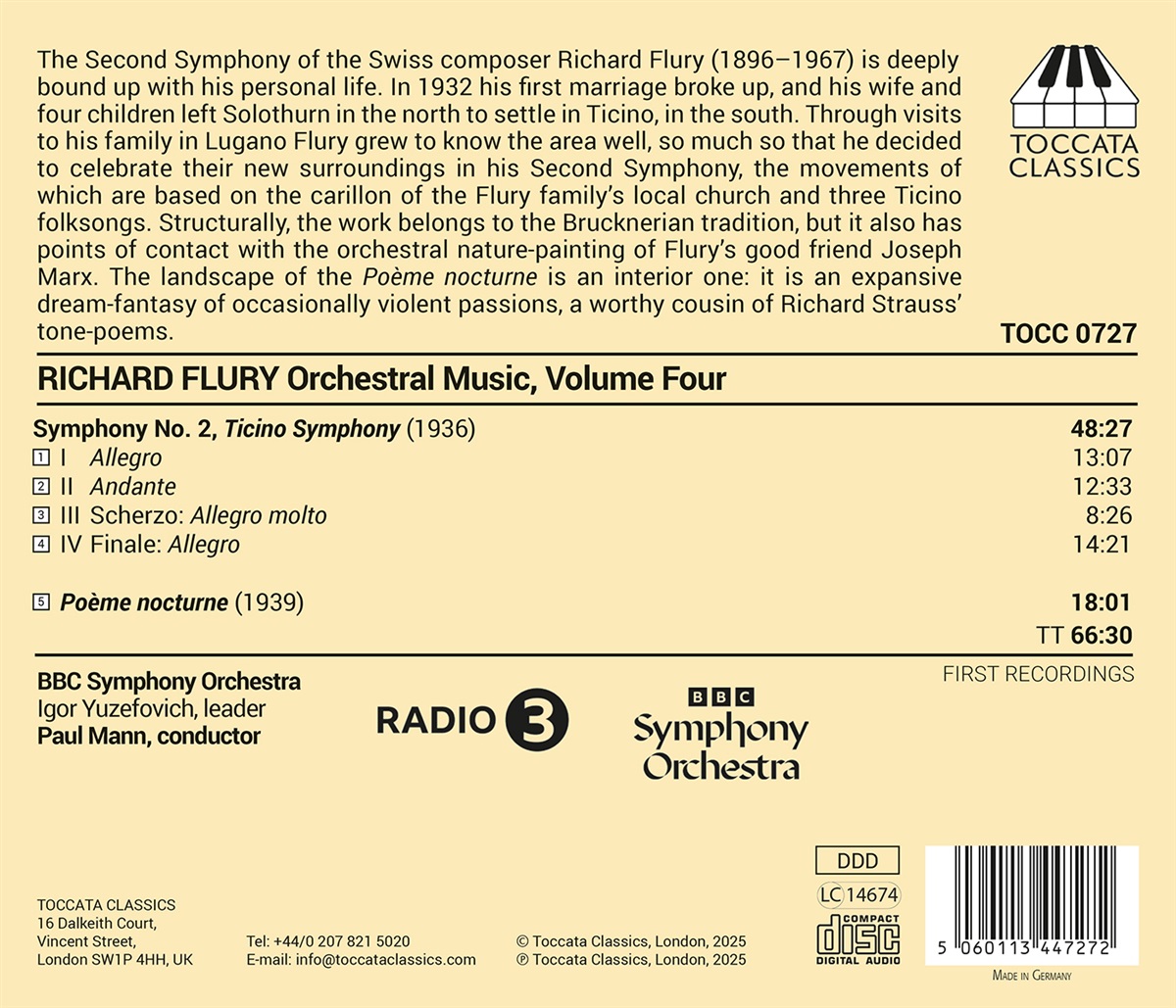Die Zweite Sinfonie des Schweizer Komponisten Richard Flury (1896–1967) ist eng mit seinem Privatleben verbunden. 1932 zerbrach seine erste Ehe und seine Frau und seine vier Kinder verließen Solothurn im Norden, um sich im Tessin im Süden niederzulassen. Durch Besuche bei seiner Familie in Lugano lernte Flury die Gegend gut kennen, und zwar so gut, dass er beschloss, die neue Umgebung in seiner zweiten Sinfonie zu würdigen, deren Sätze auf dem Glockenspiel der örtlichen Kirche der Familie Flury und drei Tessiner Volksliedern basieren. Strukturell gehört das Werk zur Bruckner-Tradition, hat aber auch Berührungspunkte mit der orchestralen Naturmalerei von Flurys gutem Freund Joseph Marx. Die Landschaft des „Poème nocturne“ ist eine innere: Es ist eine ausgedehnte Traumfantasie von gelegentlich heftigen Leidenschaften, eine würdige Cousine der Tondichtungen von Richard Strauss. Paul Mann dirigiert das BBC Symphony Orchestra. Mann ist regelmäßiger Gast bei vielen großen Orchestern in ganz Europa, den USA, Australien und dem Fernen Osten. Nachdem er Chefdirigent des Odense Symphony Orchestra in Dänemark war, begann er eine Karriere im Aufnahmestudio und hat in den letzten Jahren viele Alben mit seltenem und bisher unveröffentlichtem Repertoire produziert.