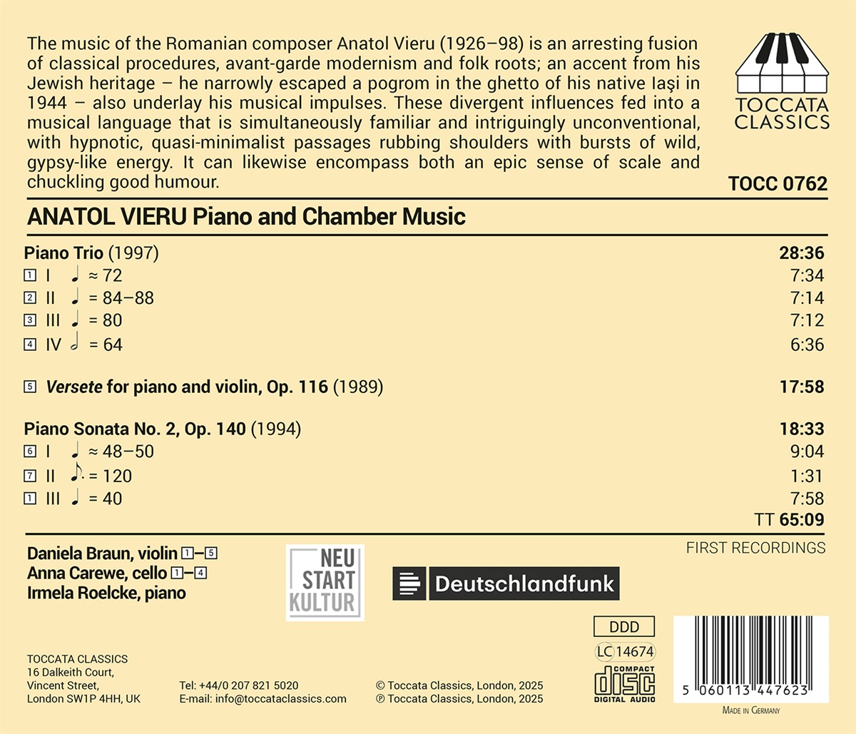 Die Musik des Rumänen Anatol Vieru - einem hierzulande kaum bekannten Komponisten des 20. Jahrhunderts ist eine fesselnde Verschmelzung von klassischen Techniken, avantgardistischer Moderne und volkstümlichen Wurzeln. Der Einfluss seiner jüdischen Wurzeln – er entkam 1944 nur knapp einem Pogrom im Ghetto seiner Heimatstadt Iași – prägte ebenfalls seine musikalische Klangsprache. Die unterschiedlichen Einflüsse flossen in eine musikalische Sprache ein, die gleichzeitig vertraut und faszinierend unkonventionell ist, mit hypnotischen, quasi-minimalistischen Passagen, die sich mit Ausbrüchen wilder, Roma-ähnlicher Energie abwechseln. Sie kann gleichermaßen ein episches Gefühl für Größe oder schallendes Gelächter umfassen.