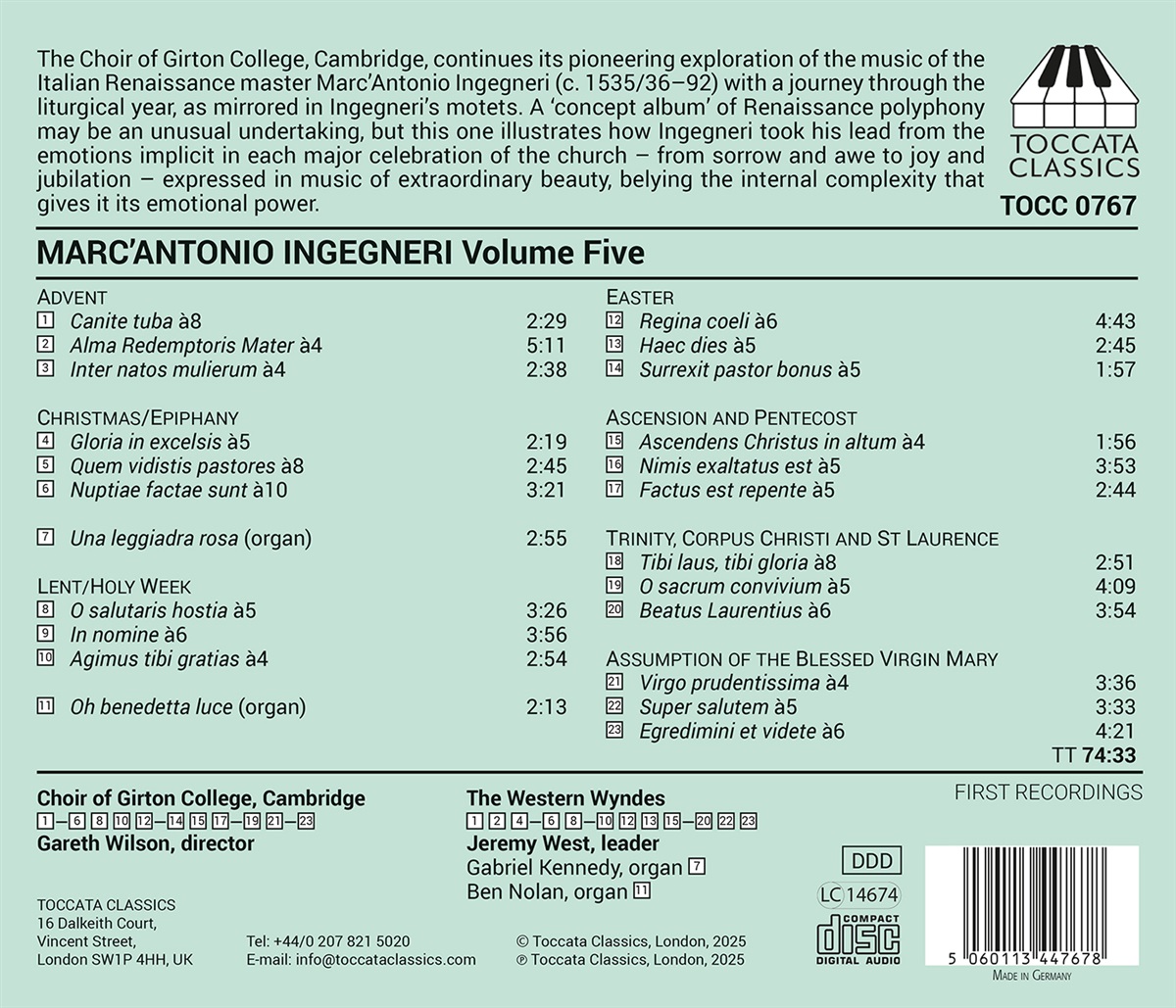 Der Chor des Girton College in Cambridge setzt seine Pionierarbeit bei der Erforschung der Musik des italienischen Renaissance-Meisters Marc'Antonio Ingegneri (ca. 1536/36–92) mit einer Reise durch das liturgische Jahr fort, wie sie sich in Ingegneris Motetten widerspiegelt. Ein „Konzeptalbum“ der Renaissance-Polyphonie mag ein ungewöhnliches Unterfangen sein, aber dieses veranschaulicht, wie Ingegneri sich von den Emotionen leiten ließ, die in jedem großen Kirchenfest zum Ausdruck kommen: von Trauer und Ehrfurcht bis hin zu Freude und Jubel. All dies wird in Musik von außergewöhnlich schlichter Schönheit ausgedrückt, die die innere Komplexität, die ihr ihre emotionale Kraft verleiht, vergessen lässt.