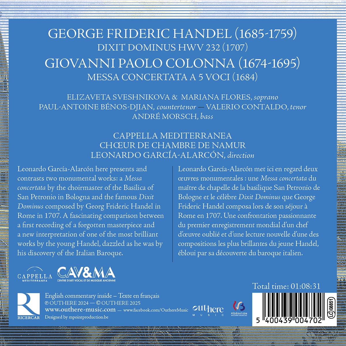 Leonardo Garcia Alarcon präsentiert und kontrastiert hier zwei monumentale Werke: eine Messa Concertata von Giovanni Paolo Colonna, des Chorleiters der Basilika San Petronio in Bologna und das berühmte Dixit Dominus, das Georg Friedrich Händel 1707 in Rom komponierte. Ein faszinierender Vergleich zwischen der Ersteinspielung eines vergessenen Meisterwerks und der Neuinterpretation eines der brillantesten Werke des jungen Händel, der von seiner Begegnung mit dem italienischen Barock geradezu verzaubert war.