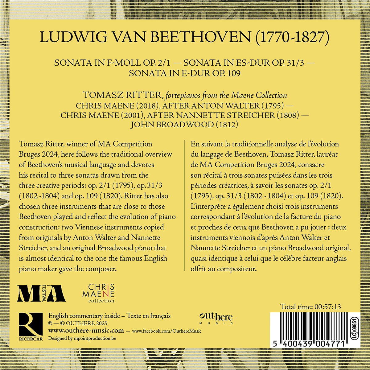 Tomasz Ritter, Gewinner des Brügge-Festival-Wettbewerbs 2024, folgt mit diesem Programm dem traditionellen Überblick über Beethovens musikalische Sprache und widmet sein Rezital drei Sonaten aus drei Schaffensperioden: op. 2/1 (1795), op. 31/3 (1802) und op. 109 (1820). Ritter hat dafür drei Instrumente ausgewählt, die den von Beethoven gespielten Instrumenten sehr nahe kommen und die Entwicklung des Klavierbaus widerspiegeln: zwei Wiener Instrumente, die nach Originalen von Anton Walter und Nanette Streicher kopiert wurden, und einen originalen Broadwood-Flügel, der fast identisch mit dem ist, den der berühmte englische Klavierbauer dem Komponisten geschenkt hat.