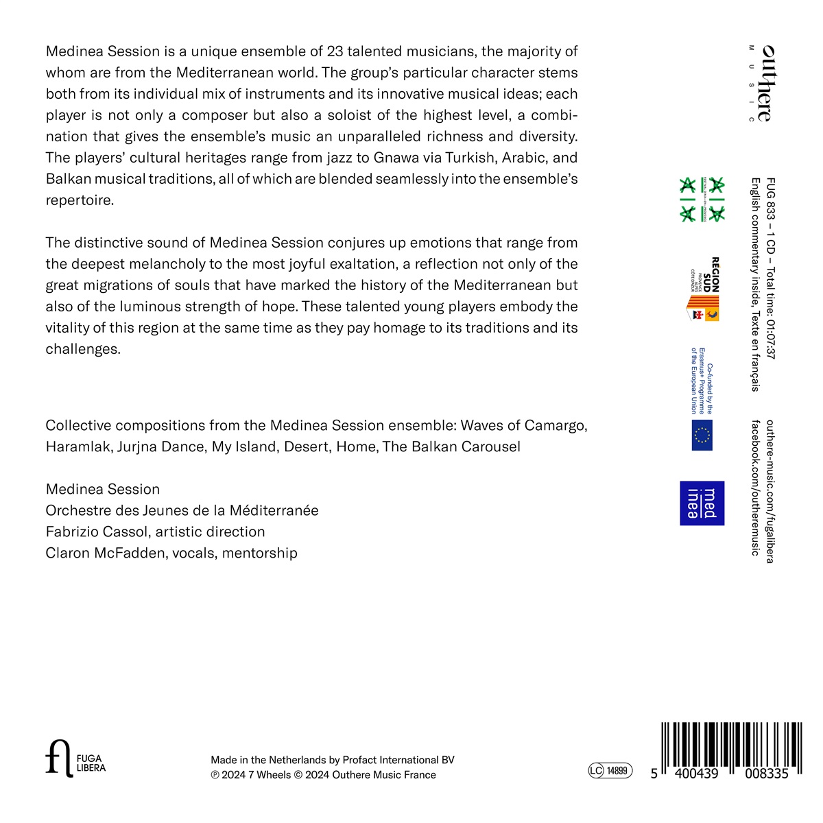 Medinea Session ist ein einzigartiges Ensemble von 23 talentierten Musikern, von denen die meisten aus der mediterranen Welt stammen. Der besondere Charakter der Gruppe ergibt sich sowohl aus der individuellen Mischung der Instrumente als auch aus den innovativen musikalischen Ideen; jeder Spieler ist nicht nur Komponist, sondern auch Solist auf höchstem Niveau, eine Kombination, die der Musik des Ensembles einen unvergleichlichen Reichtum und Vielfalt verleiht. Das kulturelle Erbe der Spieler reicht von Jazz bis Gnawa über türkische, arabische und balkanische Musiktraditionen, die alle nahtlos in das Repertoire des Ensembles einfließen. Die Sopranistin Claron McFadden zelebriert gemeinsam mit dem Ensemble die Klangwelt der Mittelmeerregion.