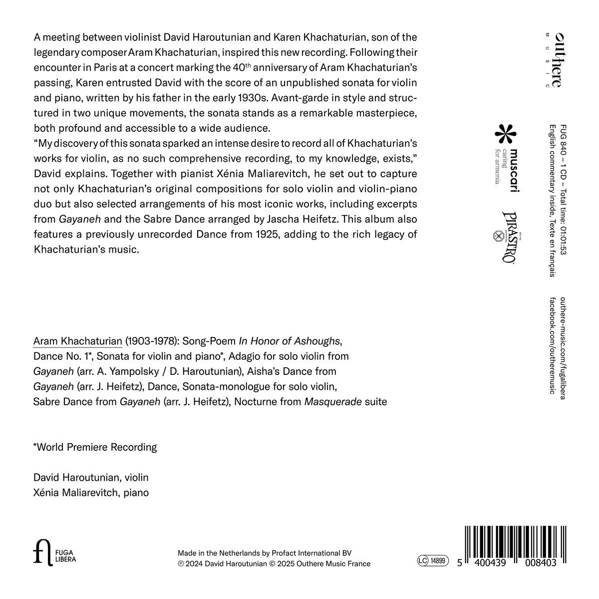 Eine Begegnung zwischen dem Geiger David Haroutunian und Karen Khachaturian, dem Sohn des legendären Komponisten Aram Khachaturian, inspirierte diese neue Aufnahme. Nach ihrer Begegnung in Paris bei einem Konzert zum 40. Todestag von Aram Khachaturian vertraute Karen dem Geiger die Partitur einer unveröffentlichten Sonate für Violine und Klavier an, die sein Vater in den frühen 1930er Jahren geschrieben hatte. Mit ihrem avantgardistischen Stil und ihrer Gliederung in zwei einzigartige Sätze ist die Sonate ein bemerkenswertes Meisterwerk, das zugleich tiefgründig und für ein breites Publikum zugänglich ist. „Meine Entdeckung dieser Sonate weckte in mir den Wunsch, alle Violinwerke von Khachaturian aufzunehmen, da es meines Wissens keine umfassende Einspielung gibt“, erklärt David. Gemeinsam mit der Pianistin Xénia Maliarevitch machte er sich daran, nicht nur Khachaturians Originalkompositionen für Violine solo und die Duos für Violine und Klavier aufzunehmen, sondern auch ausgewählte Bearbeitungen seiner bekanntesten Werke, darunter Auszüge aus Gayaneh und den Säbeltanz in einer Bearbeitung von Jascha Heifetz. Dieses Album enthält auch einen bisher nicht aufgenommenen Tanz aus dem Jahr 1925, der das reiche Erbe von Khachaturians Musik noch erweitert.