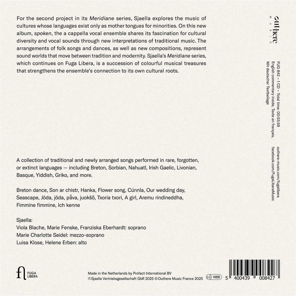 In der zweiten Folge ihrer Meridiane-Reihe widmet sich das Vokalensemble Sjaella der Musik aus Kulturen, deren Sprachen nur noch als Muttersprachen von Minderheiten existieren. Auf ihrem neuen Album „spoken" teilt das A-cappella-Ensemble seine Faszination für kulturelle Vielfalt und vokale Klangwelten durch neue Interpretationen traditioneller Musik. Die Arrangements von Volksliedern und Tänzen sowie neue Kompositionen erschaffen Klangräume, die zwischen Tradition und Moderne oszillieren. Sjaellas Meridiane-Reihe, die auf Fuga Libera fortgesetzt wird, ist eine Folge farbenreicher musikalischer Kostbarkeiten und vertieft zugleich die Verbindung des Ensembles zu den eigenen kulturellen Wurzeln.