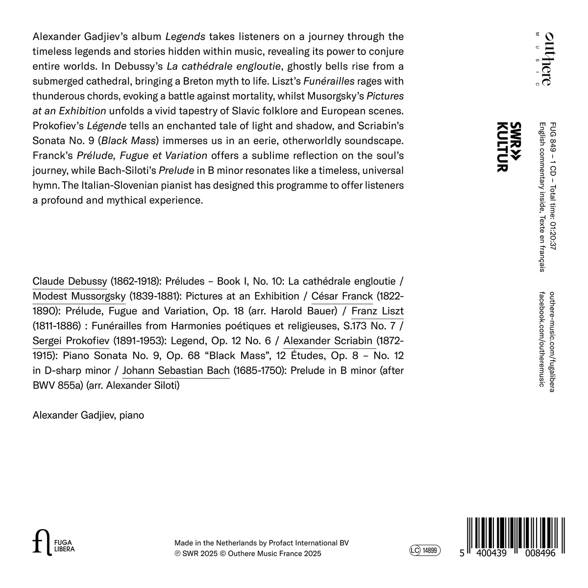 Alexander Gadjievs Album „Legends“ ist eine Einladung, die in der Musik verborgenen zeitlosen Legenden und Geschichten zu entdecken und somit die Kraft der Musik, ganze Welten zu beschwören. Mit dem Programm dieses Albums schafft der italienisch-slowenische Pianist Alexander Gadjiev ein tiefgreifendes und mystisches Erlebnis. In Debussys „La cathédrale engloutie" steigen geisterhafte Glocken aus einer versunkenen Kathedrale auf und erwecken einen bretonischen Mythos zum Leben. Liszts „Funérailles" wütet mit donnernden Akkorden und evoziert den Kampf gegen die Sterblichkeit, während Musorgskys Werk „Bilder einer Ausstellung" einen lebhaften Bildteppich aus slawischer Folklore und europäischen Motiven entfaltet. Prokofjews „Légende" erzählt eine märchenhafte Geschichte von Licht und Schatten, und Skrjabins Sonate Nr. 9 (Schwarze Messe) lässt uns in eine unheimliche, jenseitige Klangwelt eintauchen. Francks „Prélude, Fugue et Variation" bieten eine Reflexion über die Reise der Seele, während Bach-Silotis h-Moll-Präludium wie eine zeitlose, universelle Hymne erklingt.