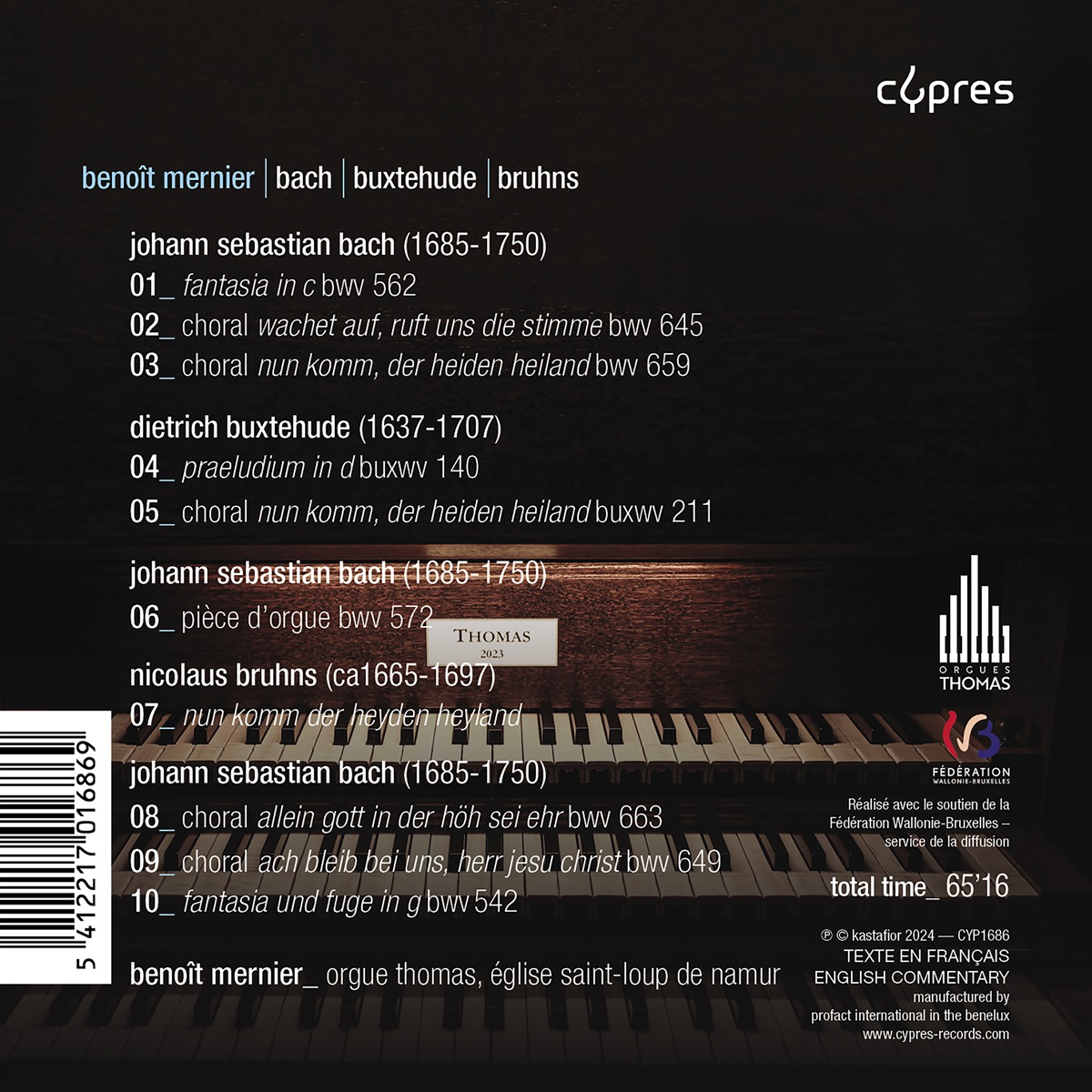 Die Entstehung dieser CD ist das Ergebnis mehrerer Wünsche. Seit 2015 ist der Organist und Komponist Benoît Mernier in den Bau der neuen Orgel in Saint-Loup in Namur durch die Manufaktur Thomas involviert. Eine Besonderheit dieses Instruments in Originalgröße ist, dass sie sowohl vom mitteldeutschen als auch vom norddeutschen Barock inspiriert ist, kurzum das Instrument, von dem Bach zweifellos geträumt hätte. Die große Orgel von Saint-Loup bietet somit eine ideale Gelegenheit, die Beziehung zwischen Meister Buxtehude und seinen zwei Schülern, Bach und Bruhns nachzuzeichnen. Diese Einspielung feiert nicht nur die Fertigstellung dieser außergewöhnlichen neuen Orgel, sondern markiert auch den 60. Geburtstag der Organisten Benoît Mernier.