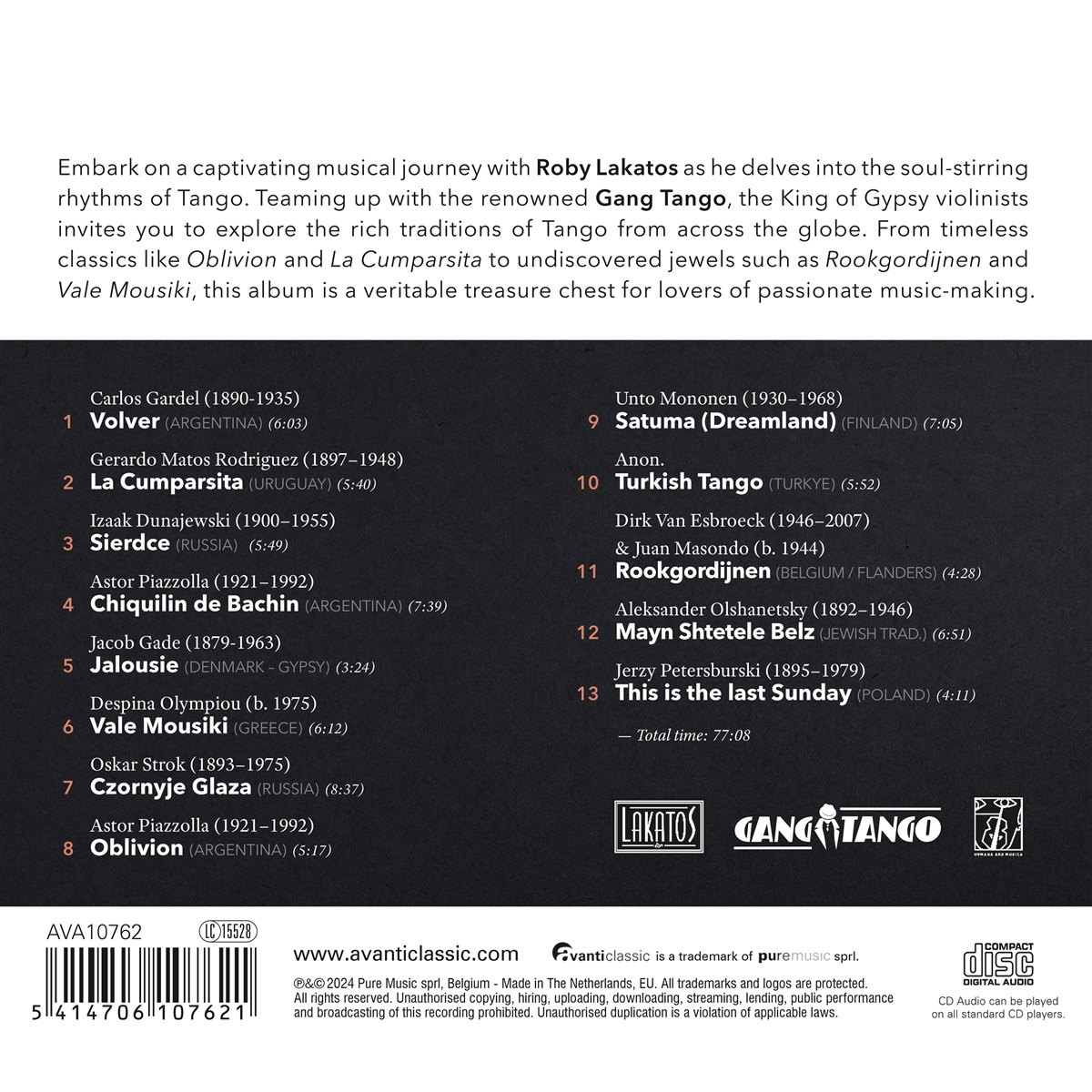 Begeben Sie sich mit Roby Lakatos auf eine fesselnde musikalische Reise zu den mitreißenden Rhythmen des Tango. Zusammen mit der renommierten Gang Tango lädt Sie der König der Zigeunergeiger ein, die reichen Tangotraditionen aus aller Welt zu entdecken. Von zeitlosen Klassikern wie „Oblivion“ und „La Cumparsita“ bis hin zu unentdeckten Juwelen wie „Rookgordijnen“ und „Vale Mousiki“ ist dieses Album eine wahre Schatztruhe für Liebhaber leidenschaftlicher Musik.