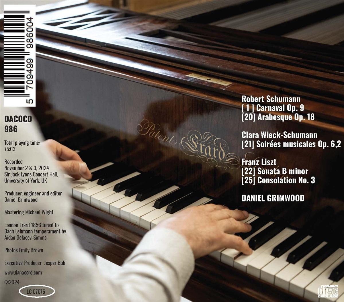 Die Universität York ist in der glücklichen Lage, diesen exquisiten Londoner Konzertflügel von Erard aus dem Jahr 1856 zu besitzen, der von Nigel Scaife liebevoll restauriert und von Aidan Delacey-Simms auf die Bach-Lehman-Temperatur gestimmt wurde. Der Flügel ist gerade besaitet, was eine größere Trennung der Register im Vergleich zu seinem homogeneren modernen Gegenstück ermöglicht. Die Saiten werden von unten und nicht wie bei modernen Klavieren von oben gedämpft, eine weniger effiziente Konstruktion, die zu einem angenehmen Ergebnis führt, nämlich zu einem Farbenspiel und einem Klang von komplexen Obertönen, was sicherlich eine ästhetische Entscheidung war. Jahrhunderts waren Klaviere wahrscheinlich nicht gleichschwebend temperiert, und meine Wahl der ungleichschwebenden Stimmung verleiht dem Instrument zusätzliche Resonanz und der Musik Farbe. Daniel Grimwood ist bekannt als einer der weltweit führenden Vertreter des virtuosen Klavierrepertoires des 19. Seine von der Kritik hochgelobten Aufnahmen und Aufführungen der Musik von Adolph von Henselt begründen seinen internationalen Ruf als bahnbrechender, inspirierender Musiker und machen ihn zu einer einzigartigen Stimme unter den Pianisten seiner Generation. Seine Einspielung der kompletten Etüden von Henselt erhielt vom Gramophone Magazine den Status eines „Instant Classic“ und wurde zudem zur Klavierveröffentlichung des Jahres 2023 gekürt.