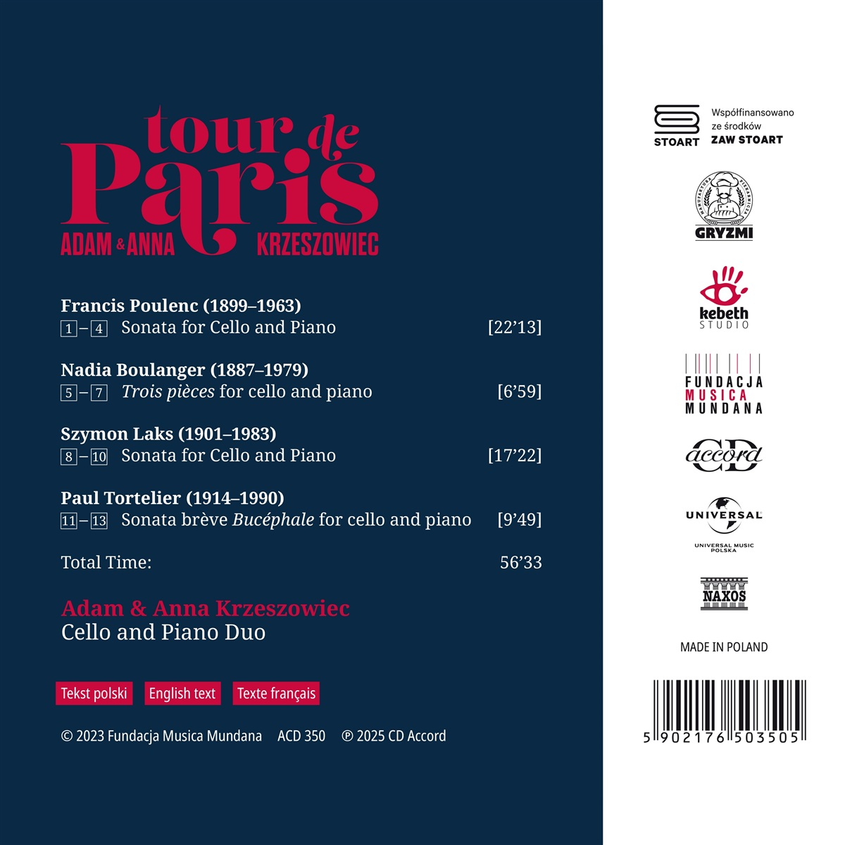 Spaziergänge in Paris werden durch die unzähligen Plätze dieser Stadt noch angenehmer – mit Bänken im Schatten von Platanen, verwinkelten Gehwegen und einer nostalgischen Atmosphäre. Diese Orte erinnern mit ihren Namen auch an Politiker, Gelehrte und Künstler, die in der französischen Hauptstadt tätig waren, darunter die Protagonisten dieses Albums – Nadia Boulanger, Francis Poulenc und Paul Tortelier. Simon (Szymon) Laks hat zwar keinen eigenen Platz, aber auch er war mit Paris verbunden, wo er einige der glücklichsten Jahre seines Lebens verbrachte. Die Musiker Anna und Adam Krzeszowiec sind im Leben und auf der Bühne ein Paar und begannen ihre gemeinsamen Auftritte im Jahr 2010. Die größte Freude finden sie in der Interpretation von Meisterwerken der Kammermusik (Ludwig van Beethoven, Johannes Brahms, Franz Schubert), gleichzeitig entdecken sie weniger bekannte Musik und präsentieren sie auf Bühnen im In- und Ausland. Ihr Repertoire ist eine faszinierende Reise durch die Epochen – von der Klassik bis zur zeitgenössischen Komposition. Adam, einer der führenden Cellisten der jungen Generation, wurde zum Solocellisten des Polnischen Nationalen Rundfunk-Sinfonieorchesters (NOSPR) ernannt. Darüber hinaus tritt er als Solist und Kammermusiker auf polnischen und internationalen Bühnen auf, auch als Mitglied des international anerkannten Polnischen Celloquartetts. Anna, eine Pianistin, die sich der Kammermusik verschrieben hat, tritt regelmäßig in verschiedenen Instrumentalensembles auf. Sie arbeitet mit Musikern zusammen, die sich auf internationale Musikwettbewerbe vorbereiten, und wird als gefragte musikalische Partnerin und Lehrerin immer wieder von Institutionen wie dem NOSPR, der Cavatina Hall, der Schlesischen Philharmonie und der Internationalen Celloakademie eingeladen.