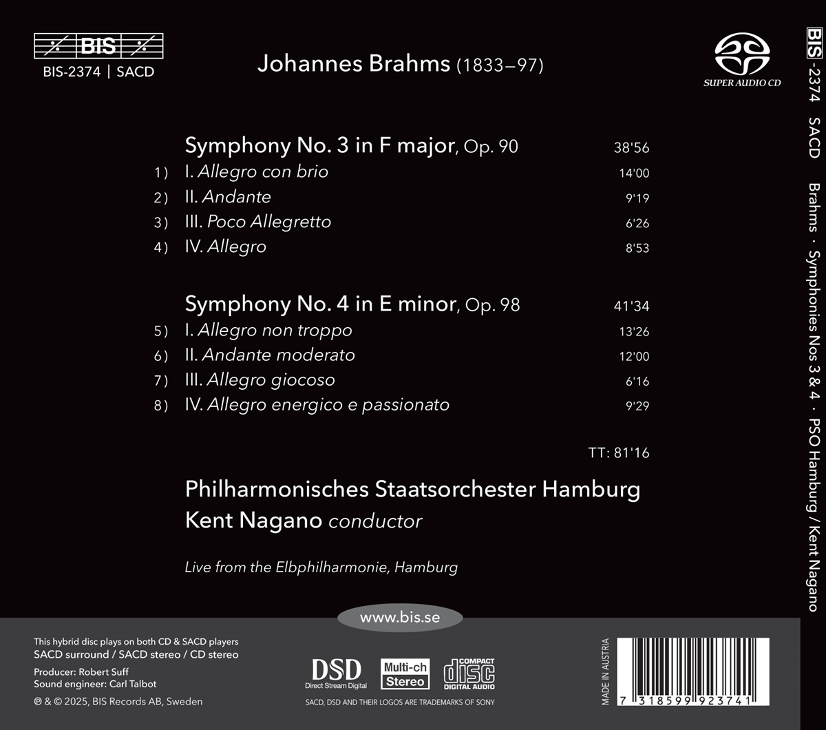 Kent Nagano, der kürzlich mit dem renommierten Brahms-Preis der Brahms-Gesellschaft Schleswig-Holstein ausgezeichnet wurde, und das Philharmonische Staatsorchester Hamburg, dessen Chefdirigent er von 2015 bis 2025 war, spielen die beiden letzten Sinfonien des in Hamburg geborenen Johannes Brahms, aufgenommen im Konzert. Die dritte Sinfonie, die persönlichste der vier Sinfonien des Komponisten, ist sowohl heroisch als auch zutiefst bewegend; darüber hinaus enden alle vier Sätze ruhig. Nach dem Heroismus der Ersten Sinfonie und den pastoralen Anklängen der Zweiten zeigt sich Brahms in der Dritten Sinfonie an einem Scheideweg: Die jugendlichen Impulse sind nun gezügelt, und die Stimmung ist eher von tiefer Reflexion über Leben und Tod geprägt. Das Thema des langsamen Satzes wurde vielfach adaptiert und sogar von Frank Sinatra unter dem Titel „Take My Love“ gesungen. Die Vierte Symphonie kann als die klassischste von Brahms' Symphonien bezeichnet werden, nicht zuletzt wegen ihres Chaconne-Finales, einer aus dem Barock übernommenen Variationsform. Als ‚Herbstsinfonie‘ oder ‚elegisch‘ bezeichnet, ist ihre Stimmung mal gequält und feurig, mal hart und einsam. Als Höhepunkt eines Genres, das ihn so viel Mühe gekostet hat, ist die Vierte das letzte Wort des Sinfonikers Brahms; er sollte nie wieder ein Werk dieser Art komponieren.