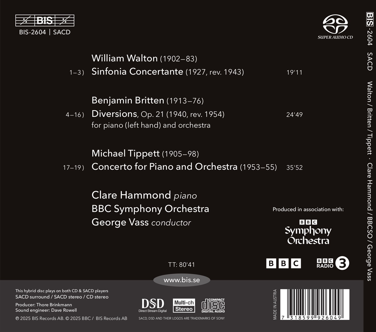 William Waltons „Sinfonia Concertante für Orchester mit Klavier-Obbligato” begann als Ballettmusik. Nachdem sie von Sergei Diaghilev abgelehnt worden war, arrangierte Walton seine Partitur zu einem schlankeren, direkteren und wirkungsvolleren Werk. Benjamin Brittens „Diversions” wurde vom Linkshänder-Pianisten Paul Wittgenstein in Auftrag gegeben. Michael Tippetts Klavierkonzert rundet das Programm ab. Inspiriert von einer Aufführung von Beethovens viertem Klavierkonzert war Tippett überzeugt, dass ein zeitgenössisches Konzert geschrieben werden könne, „in dem das Klavier wieder für seine poetischen Fähigkeiten eingesetzt wird”.
