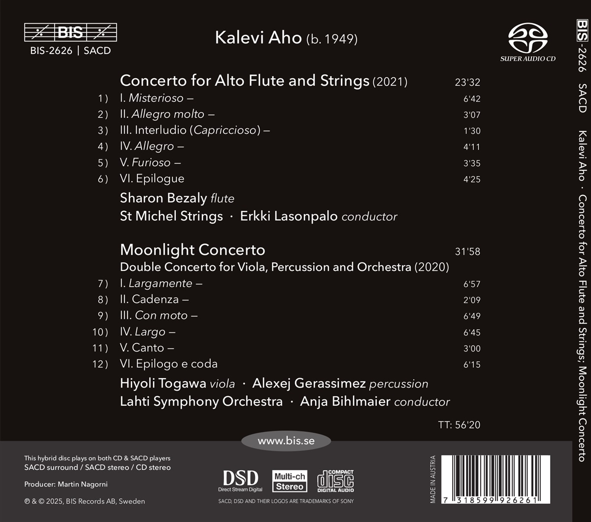 Diese Aufnahme ist zwei aktuellen Konzerten von Kalevi Aho gewidmet, einem der bedeutendsten zeitgenössischen Komponisten Finnlands. Als Schöpfer eines ebenso bedeutenden wie vielfältigen Œuvres arbeitet Aho gerne mit herausragenden Solisten zusammen, für die er Werke komponiert, die ihre musikalischen Qualitäten, ihren Erfindungsreichtum und ihre Persönlichkeit zur Geltung bringen. Das „Konzert für Altflöte und Streicher“ setzt ein Instrument mit weichem Klang ein, das sich gut als Solist mit einem kleinen Streichorchester eignet. Das Werk besteht aus sechs Sätzen, die ohne Unterbrechung gespielt werden, und die Solistin Sharon Bezaly wechselt manchmal zur Bassflöte, was der Musik eine mystische Note verleiht. Die St Michel Strings und ihr Dirigent Erkki Lasonpalo tragen zu der geheimnisvollen Atmosphäre bei, in der lyrische und dramatische Episoden reichlich vorhanden sind. Das Doppelkonzert für Viola, Schlagzeug und Orchester mit dem Titel „Moonlight Concerto“ wurde auf Initiative eines in Berlin lebenden Musikerpaares, der Bratschistin Hiyoli Togawa und dem Schlagzeuger Alexej Gerassimez, komponiert. Hier tauchen wir ein in eine japanische Atmosphäre, die Anklänge an die 1000-jährige Tradition der rituellen Gagaku-Musik offenbart. In diesem Werk spielt der Schlagzeuger Instrumente, die man normalerweise in Orchesterkonzerten nicht hört, wie den Mondgong, das Waterphone, eine Hang-Trommel und neun thailändische Gongs. Das Lahti Symphony Orchestra unter der Leitung von Anja Bihlmaier liefert den reichhaltigen orchestralen Kommentar.