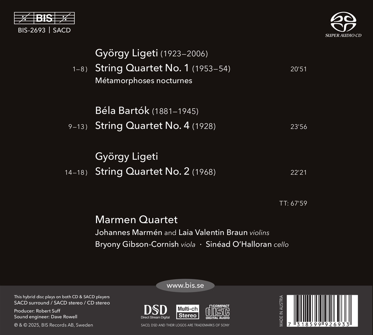Für sein neues Album hat sich das Marmen Quartet drei bedeutende Werke der Streichquartettliteratur des 20. Jahrhunderts vorgenommen. Die beiden Quartette von György Ligeti stammen aus zwei verschiedenen Schaffensperioden des Komponisten. Das Erste, mit dem Untertitel „Métamorphoses nocturnes“, wurde komponiert, ehe Ligeti Ungarn verließ und in den Westen emigrierte, und stellt den Höhepunkt seiner „ungarischen“ Periode dar. Das Werk gilt als virtuose Übung und offenbart die Einflüsse von Béla Bartók, insbesondere aus dessen Drittem und Viertem Quartett. Ligetis zweites Quartett gehört zu seiner zweiten Schaffensperiode, die besonders reich an bedeutenden Werken ist. Vom Komponisten als Antwort auf die Werke seiner berühmten Vorgänger wie Mozart, Beethoven, Bartók und Berg betrachtet, ist das zweite Quartett mit seiner kalkulierten Anarchie, seinen dynamischen Extremen und erhabenen Höhepunkten nicht nur eines von Ligetis Meisterwerken, sondern auch ein echter Klassiker der Moderne. Béla Bartóks viertes Streichquartett, das Ligeti besonders stark beeinflusste, gilt weithin als eines seiner radikalsten. Es verlangt von den Interpreten ein hohes Maß an technischer Fertigkeit, offenbart jedoch ein tiefes Verständnis für die Instrumente und entlockt ihnen eine beispiellose Bandbreite an Farben und Eigenheiten. Das Londoner Marmen Quartet hat sich seit seiner Gründung im Jahr 2013 als eines der beeindruckendsten und engagiertesten Ensembles im Bereich Kammermusik etabliert. Es hat zahlreiche Preise gewonnen, darunter den ersten Preis beim Internationalen Streichquartettwettbewerb in Bordeaux, und ist in ganz Europa sowie in den USA und Kanada aufgetreten. Außerdem nimmt es an vielen wichtigen Festivals teil.