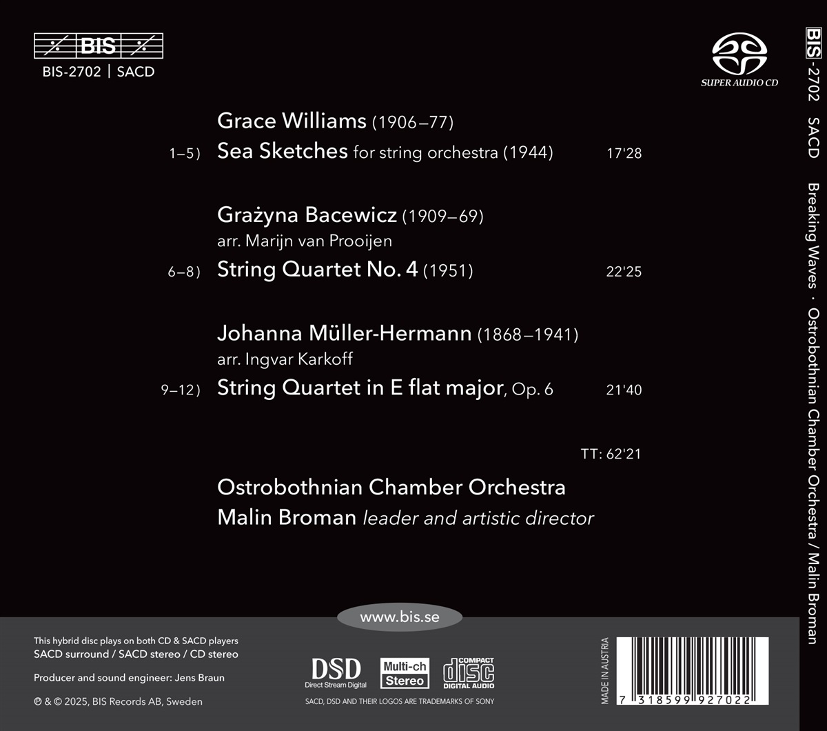Drei Werke von drei Komponistinnen aus drei verschiedenen Ländern, jedes Stück mit seiner ganz eigenen Ausdrucksweise, werden hier vom Ostrobothnian Chamber Orchestra unter der Leitung seiner dynamischen Dirigentin und künstlerischen Leiterin Malin Broman aufgeführt: Drei Werke, die zweifellos ein größeres Publikum verdienen. Den Auftakt bildet „Sea Sketches“ der walisischen Komponistin Grace Williams. Inspiriert von den Stränden von Glamorganshire und der dortigen Meereslandschaft, scheint dieses fünfteilige Werk in ständiger Bewegung und Entwicklung zu sein. Man kann förmlich die Gischt schmecken und die Kraft der Wellen spüren. Das zweite Werk ist Grażyna Bacewicz' „Viertes Streichquartett“, hier in einer Bearbeitung für Streichorchester. Bacewicz war eine wichtige Figur der polnischen Musikszene in der Mitte des 20. Jahrhunderts, und ihr Quartett ist sehr zugänglich – was zweifellos dazu beigetragen hat, dass es ihr bekanntestes Werk ist –, mit Einflüssen aus der Volksmusik und Passagen, die laut Malin Broman nur als himmlisch bezeichnet werden können. Das „Streichquartett“ der in Wien geborenen Johanna Müller-Hermann, ebenfalls in einer Bearbeitung für Streichorchester, bildet den Abschluss des Programms. Dieses spannende, schöne und kraftvolle Werk mit seiner postromantischen Sprache ist ein Zeugnis der Blütezeit Wiens, als die Musik von Gustav Mahler, Richard Strauss und ihrem Lehrer Alexander von Zemlinsky die Musikwelt beherrschte.