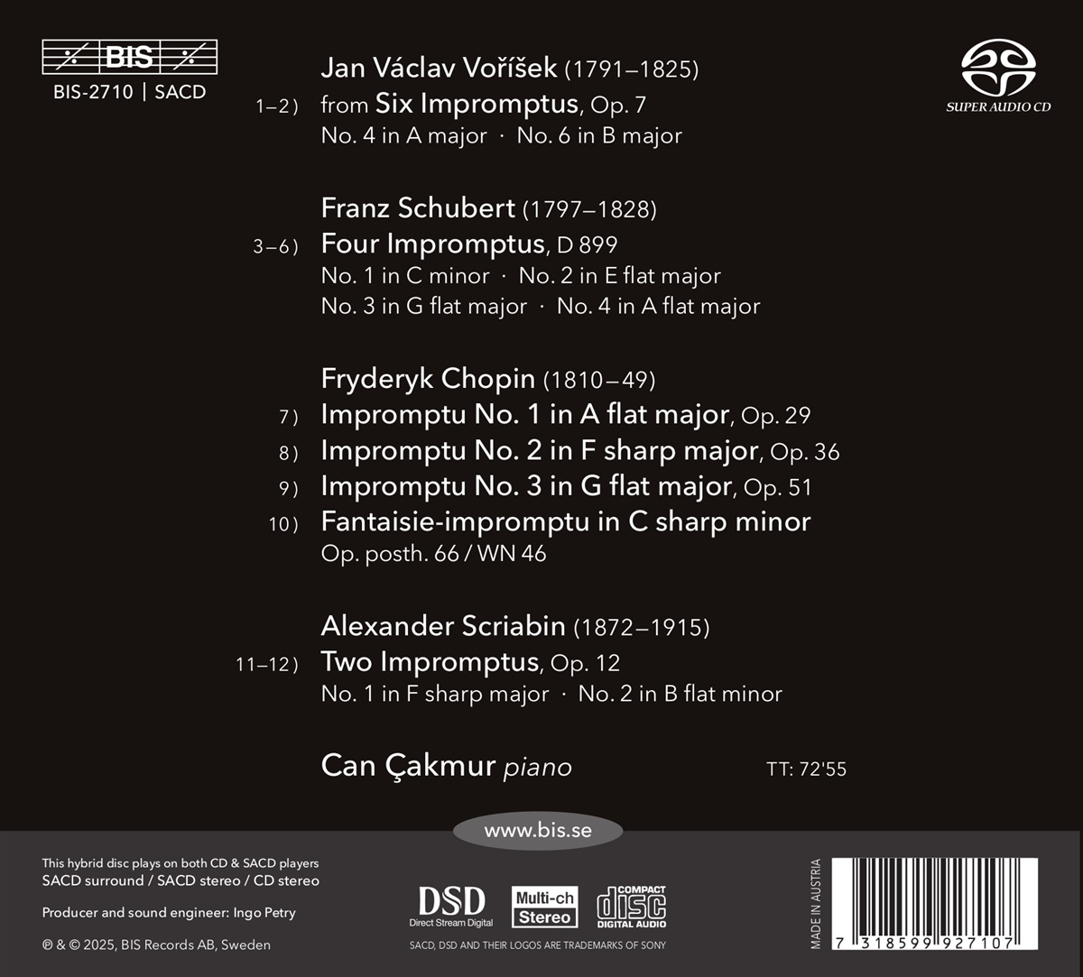 In der vierten Ausgabe seiner „Schubert+“-Reihe, die aus elf Teilen bestehen wird, konzentriert sich Can Çakmur auf das Genre des Impromptus. Er möchte historische Vorläufer für Franz Schuberts Klaviersatz identifizieren und einen Einblick in die Entwicklung eigenständiger poetischer Kompositionen für Tasteninstrumente gewinnen. Im Mittelpunkt dieser Aufnahme steht Franz Schuberts berühmtes Impromptus-Set D 899. Çakmur präsentiert außerdem zwei Impromptus von Jan Václav Voříšek, einem Komponisten, der von Beethoven gelobt wurde und Schubert vorwegzunehmen scheint. Vier Werke von Frédéric Chopin und zwei von Alexander Skrjabin vervollständigen das Programm und zeugen von der Vorliebe der Komponisten für diese freie Form, die einen Moment, ein Gefühl oder eine Stimmung romantisch ausdrücken kann. Can Çakmurs jüngste Aufnahmen, die Schuberts Hauptwerke für Klavier neben Werke anderer Komponisten stellen, wurden von der internationalen Presse begeistert aufgenommen und mit zwei aufeinanderfolgenden ICMA-Awards (eine Premiere in der Geschichte der Awards) für die Soloeinspielung des Jahres und für den Nachwuchskünstler des Jahres ausgezeichnet. Außerdem erhielt sie den Choc de Classica, den Diapason d'Or, das Album des Monats von International Piano und die volle Punktzahl von Crescendo, Gramophone, Pizzicato und einigen weiteren Magazinen.