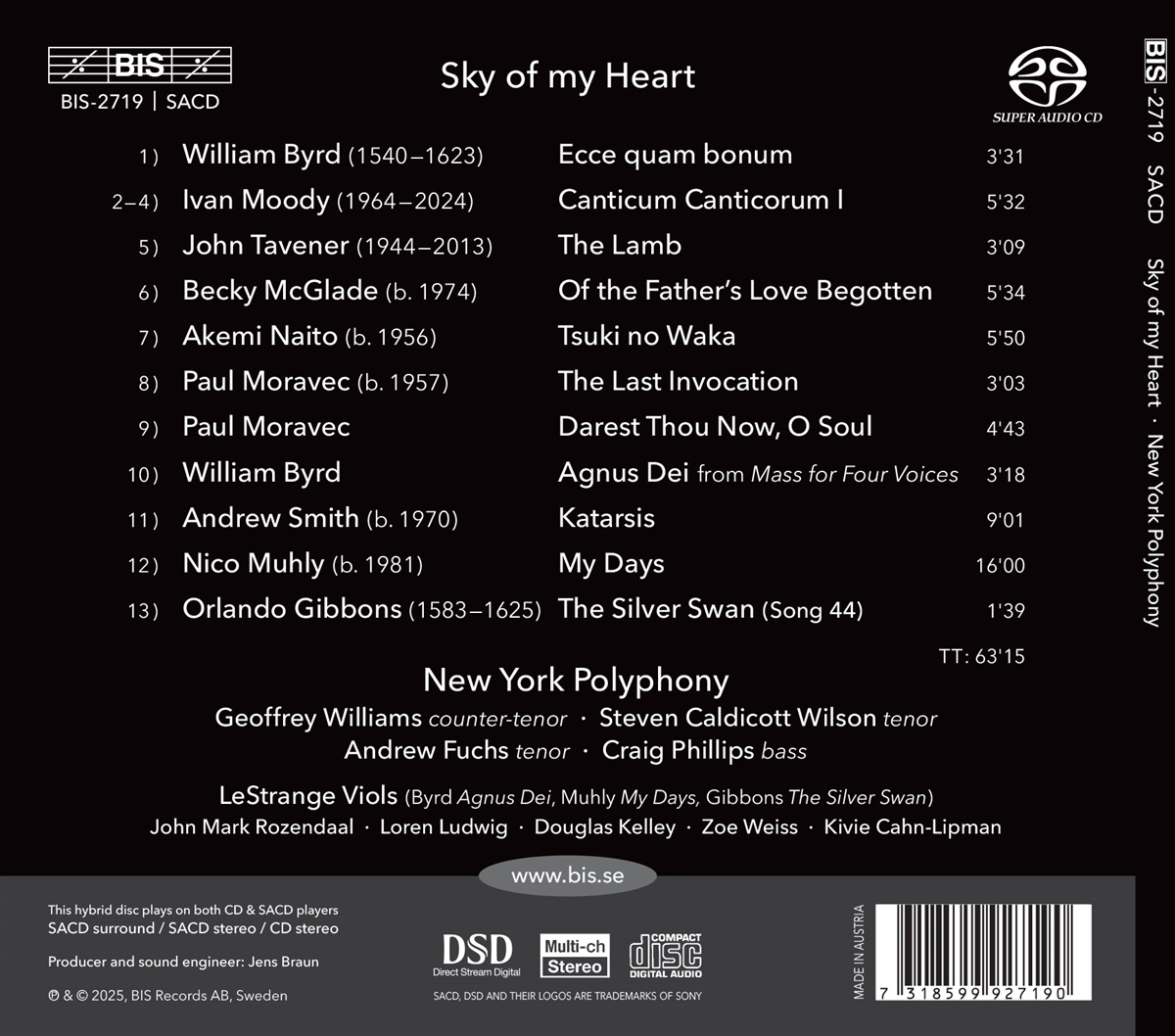New York Polyphony, eines der führenden Vokalensembles der Gegenwart, ist bekannt für sein innovatives Programm, das von gregorianischen Gesängen bis hin zu zeitgenössischen Auftragswerken reicht. Auf „Sky of my Heart“ umfasst die Auswahl mehr als vierhundert Jahre Musikgeschichte und zeugt vom Engagement dieses Vokalensembles, neue Werke zu entdecken und zu entwickeln, die sein Kernrepertoire der Alten Musik bereichern. Einige der hier aufgeführten Werke beschäftigen sich mit den grundlegenden Themen Leben, Tod und Jenseits und sind von persönlichen Verlusten (Andrew Smith) oder den Auswirkungen der Covid-Beschränkungen (Paul Moravec) inspiriert. Andere sind von einer spirituellen Atmosphäre durchdrungen, sei es religiös (William Byrd, Ivan Moody, John Tavener und Becky McGlade) oder meditativ (Akemi Naito). Die zeitgenössischen Werke, von denen einige im Auftrag von New York Polyphony geschrieben wurden, sind fest in der reichen Geschichte des Gregorianischen Chorals verwurzelt und zeichnen sich gleichzeitig durch sehr zeitgenössische Harmonien aus. Das Vokalensemble wird in drei Stücken von LeStrange Viols begleitet: „My Days“ von Nico Muhly, eine ritualisierte Hommage an den englischen Komponisten Orlando Gibbons aus dem frühen 17. Jahrhundert, „The Silver Swan“ von Gibbons selbst, das das Programm angemessen ruhig und ergreifend ausklingen lässt, und Byrds „Agnus Dei“. Das Viol-Ensemble fügt eine Facette hinzu, die sowohl zu Gibbons passt als auch in ihrer Klangführung originell ist.