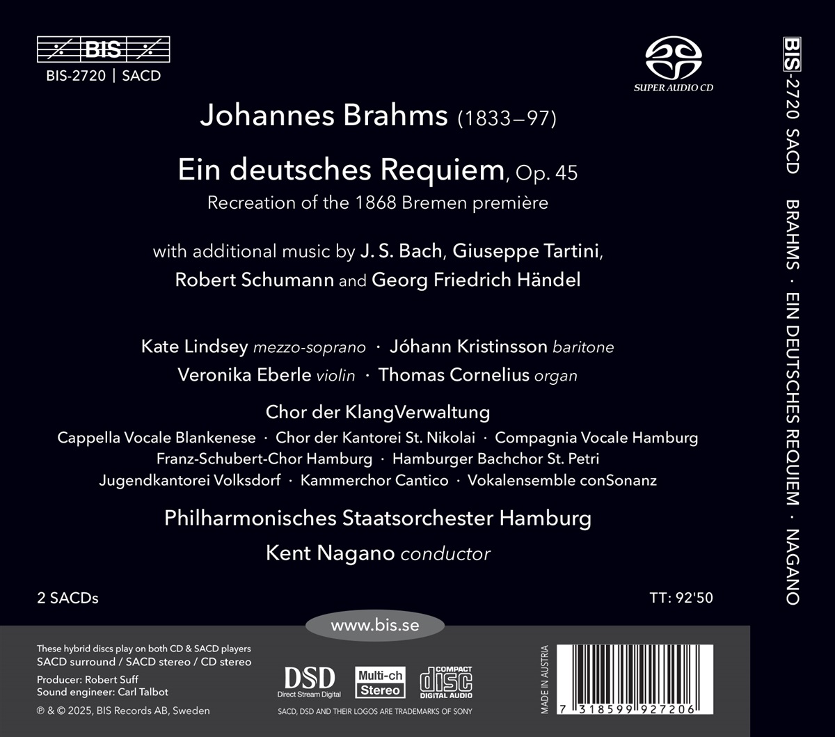 Bremen, Karfreitag 1868: 2500 Besucher erleben ein überwältigendes Konzert unter der Leitung des erst 34-jährigen Johannes Brahms. Aufgeführt werden Werke von Bach, Tartini und Robert Schumann sowie die ersten fertigen Teile seines neuesten Wurfes: „Ein Deutsches Requiem“. Zum krönenden Abschluss des umjubelten Events erklingt das „Hallelujah“ aus Händels Messias. Kent Nagano, das Philharmonische Staatsorchester Hamburg sowie über 400 Sängerinnen und Sänger haben exakt das Programm des legendären Konzertes aufgeführt. Das Album erscheint bei BIS.