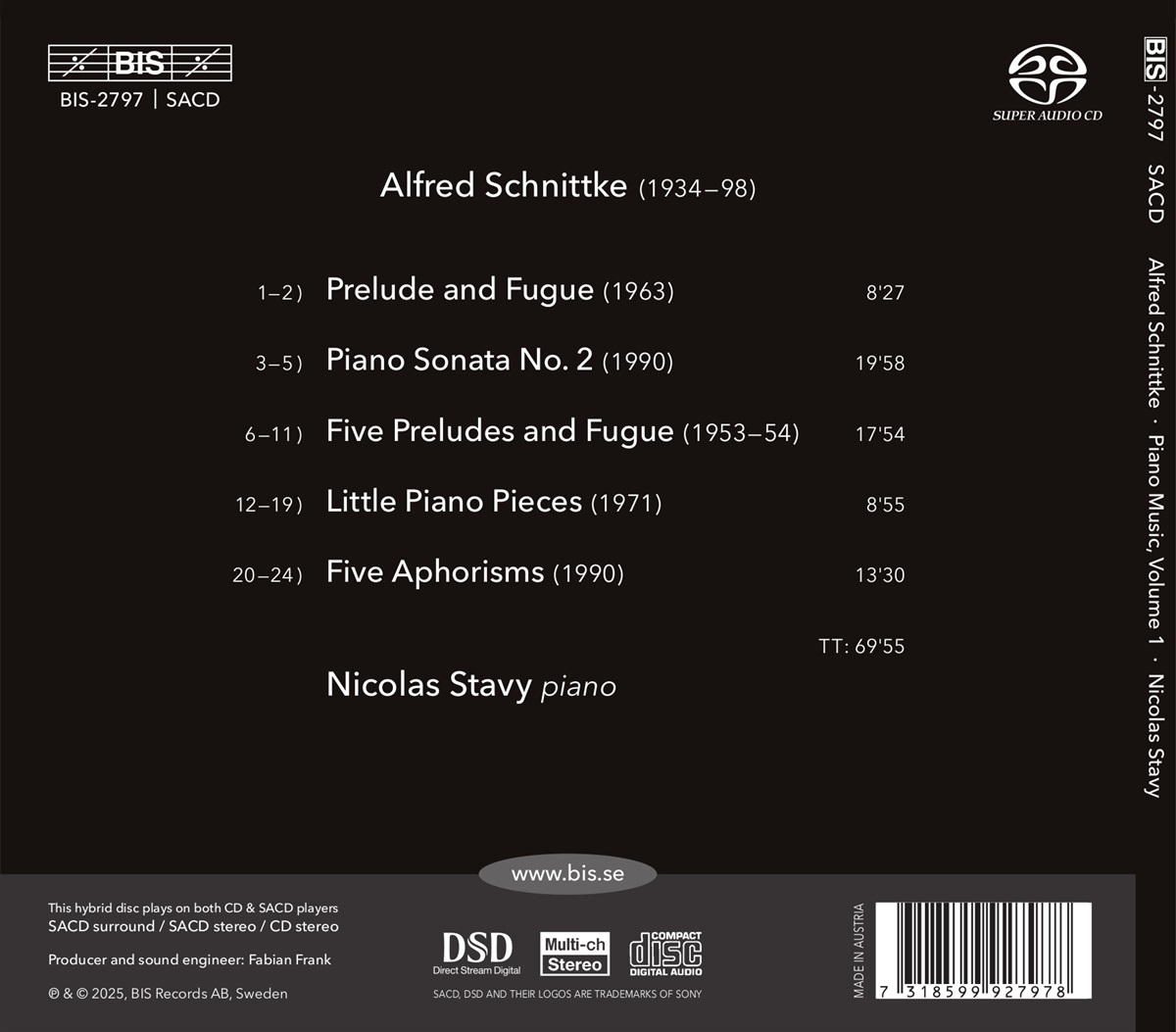 Der Pianist Nicolas Stavy, der bereits Aufnahmen mit Werken von Boris Tishchenko und Dmitri Schostakowitsch veröffentlicht hat, präsentiert nun den ersten Teil einer Gesamtaufnahme der Kompositionen für Soloklavier von Alfred Schnittke. Die Aufnahme umfasst Werke aus verschiedenen Schaffensperioden des russisch-deutschen Komponisten – von den 1950er Jahren, die Schnittke selbst als „Jahre der Dunkelheit” bezeichnete, bis zu den 1990er Jahren, einer Zeit, die sowohl von Weltruhm als auch von schwerer Krankheit geprägt war. Obwohl Schnittke relativ wenig Musik für Klavier schrieb, spiegelt jedes Werk die verschiedenen Phasen seines Schaffens wider – oder nimmt sie sogar vorweg. Die „Fünf Präludien und Fuge“ und die „Präludium und Fuge“ gehören zu Schnittkes erster Schaffensphase, als er noch unter dem Einfluss Schostakowitschs stand. Die „Kleinen Klavierstücke“, komponiert für den sechsjährigen Sohn des Komponisten, sind ein Beispiel für seinen „Polystilismus“, der Musik verschiedener Stile aus Vergangenheit und Gegenwart nebeneinanderstellt und kombiniert. Die „Sonate Nr. 2“ und die „Fünf Aphorismen“, beide aus dem Jahr 1990, kehren zu einer asketischeren und abstrakteren Sprache mit einem düstereren Ton zurück, der zweifellos seine schweren gesundheitlichen Probleme widerspiegelt.