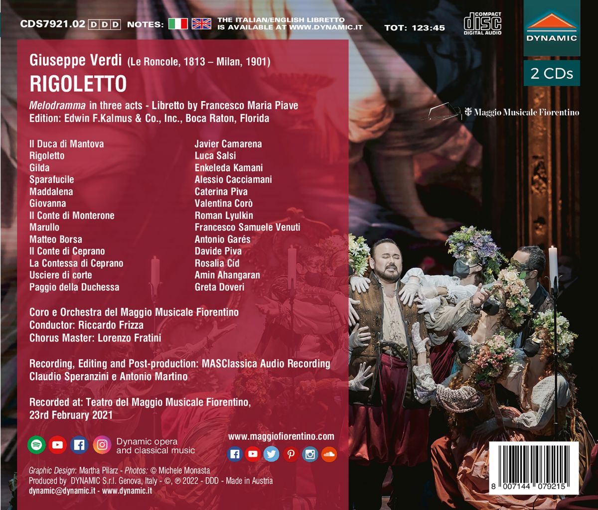 An Aufnahmen des „Rigoletto“ mangelt es wahrlich nicht. Wenn sich das italienische Label Dynamic dennoch entschlossen hat, die Aufführung aus dem Teatro del Maggio Musicale Fiorentino vom Februar 2021 auf DVD, Blu-ray, CD und digital zu veröffentlichen, dann gibt es dafür (mindestens) zwei exzellente Gründe: Zum einen ist da die fantastische Leitung von Riccardo Frizza am Pult, der mit Respekt und Sorgfalt Verdis Musik zum Strahlen bringt, zum anderen sind es die phänomenal besetzten Hauptrollen mit Enkeleda Kamani als Gilda, Javier Camerena als Duca und Luca Salsi in der Titelrolle.